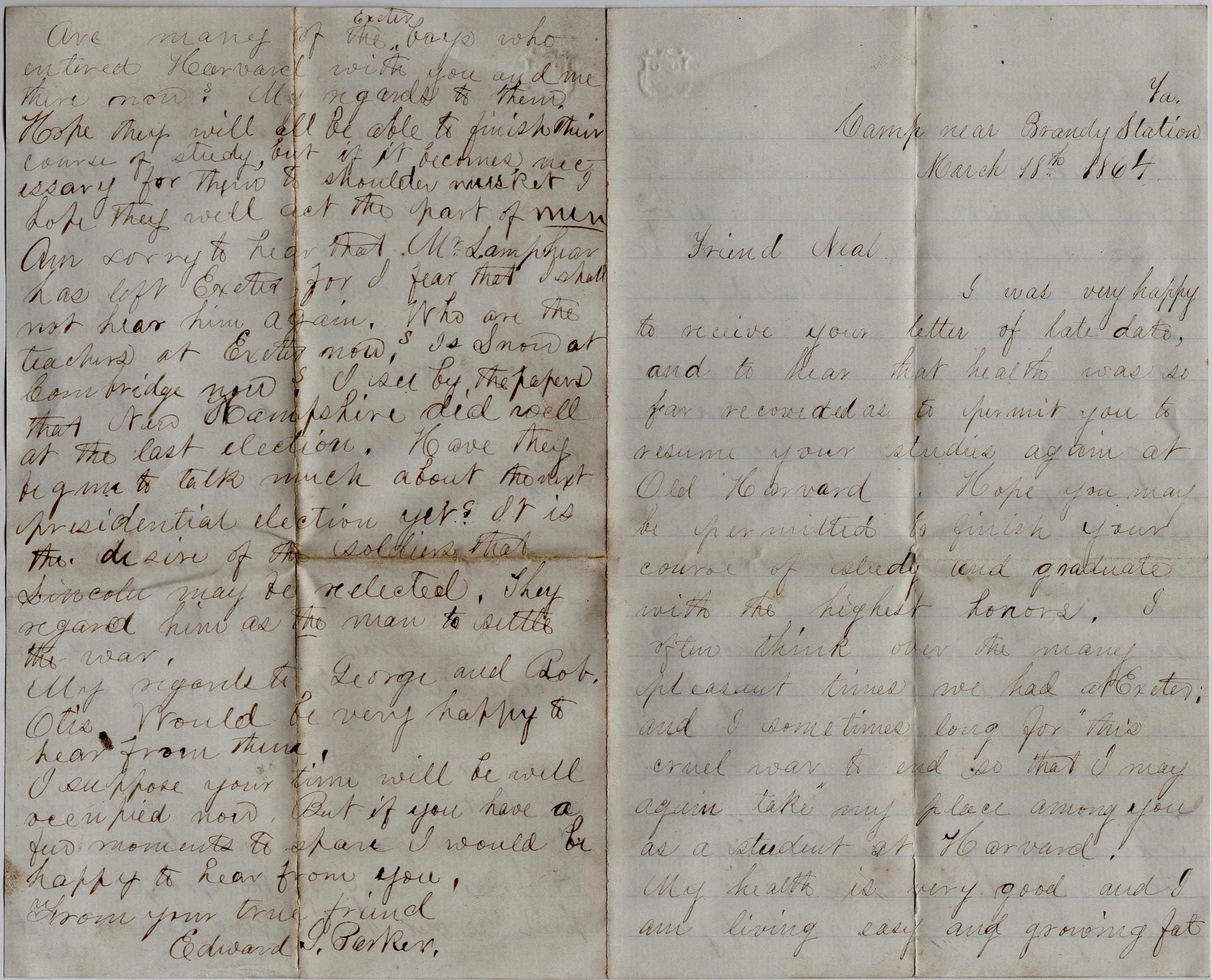 I was very happy to received your letter of late date and to hear that health was so far recovered as to permit you to resume your studies again at Old Harvard. Hope you may be permitted to finish your course of study and graduate with the highest honors. I often think over the many pleasant times we had at Exeter and I sometimes long for this cruel war to end so that I may again take my place among you as a student at Harvard. My health is very good and I am living easy and growing fat. I enjoy a soldier’s life as well as a fellow can and must set the past winter down as one of the happiest of my life. We have a very pleasant camp and is it very pleasantly situated.