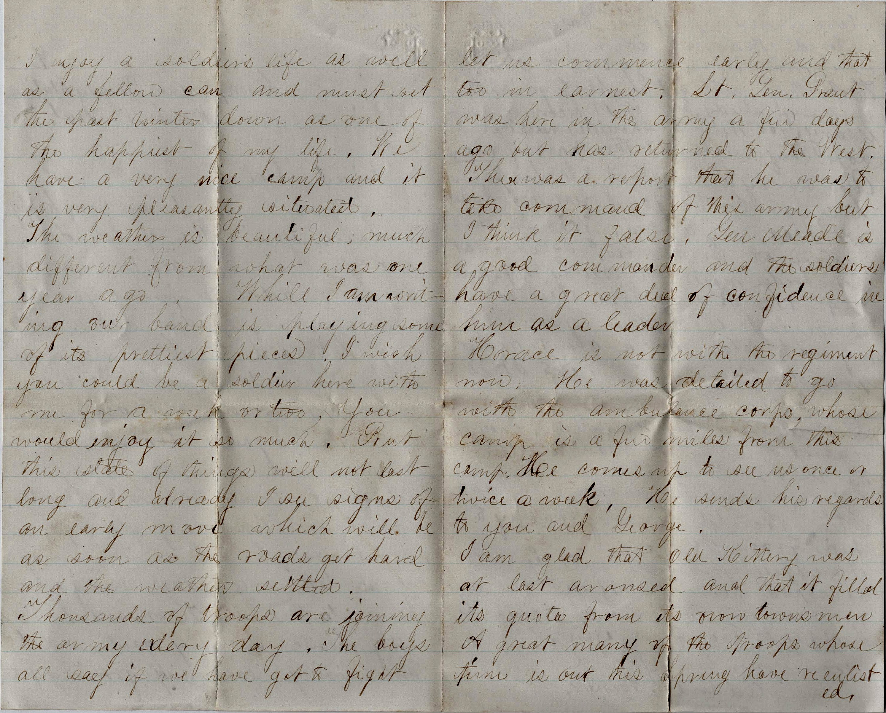 Thousands of troops are joining the army every day. The Boys all say if we have got to fight, let us commence early and that too in earnest. Lt. Gen. Grant was here in the army a few days ago, but has returned to the West. There was a report that he was to take command of this army but I think it false. Gen. Meade is a good commander and the soldiers have a great deal of confidence in him as a leader.