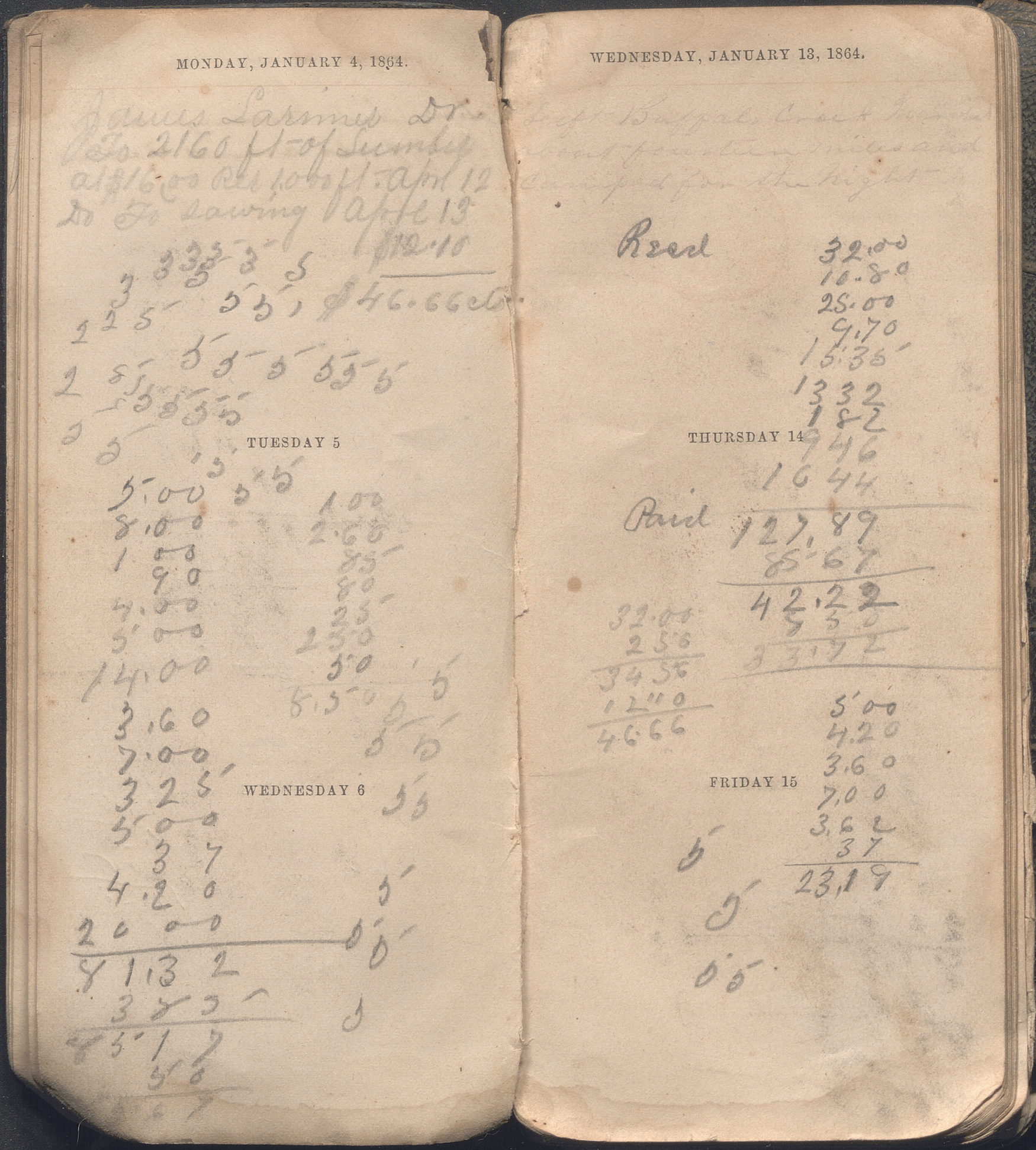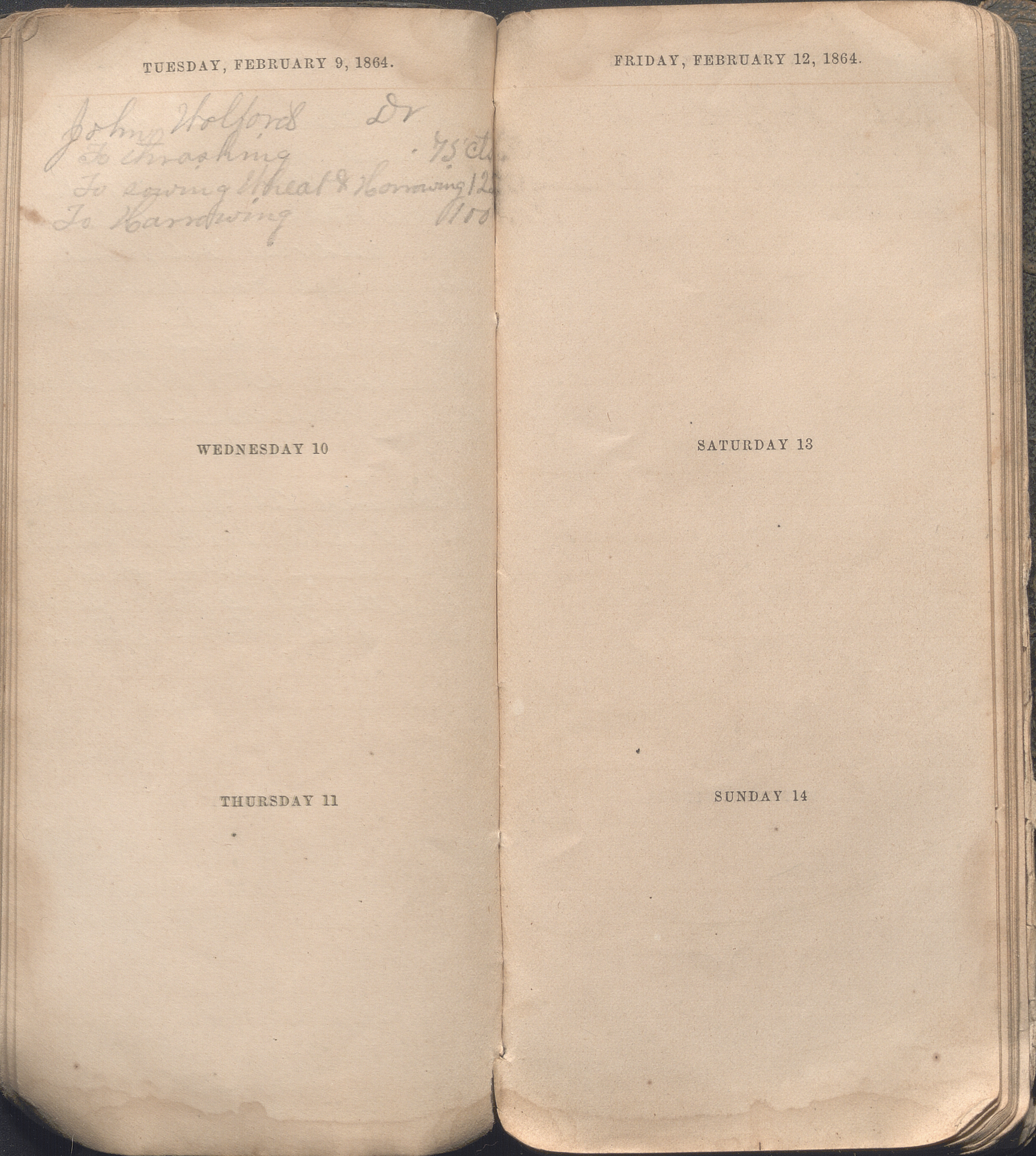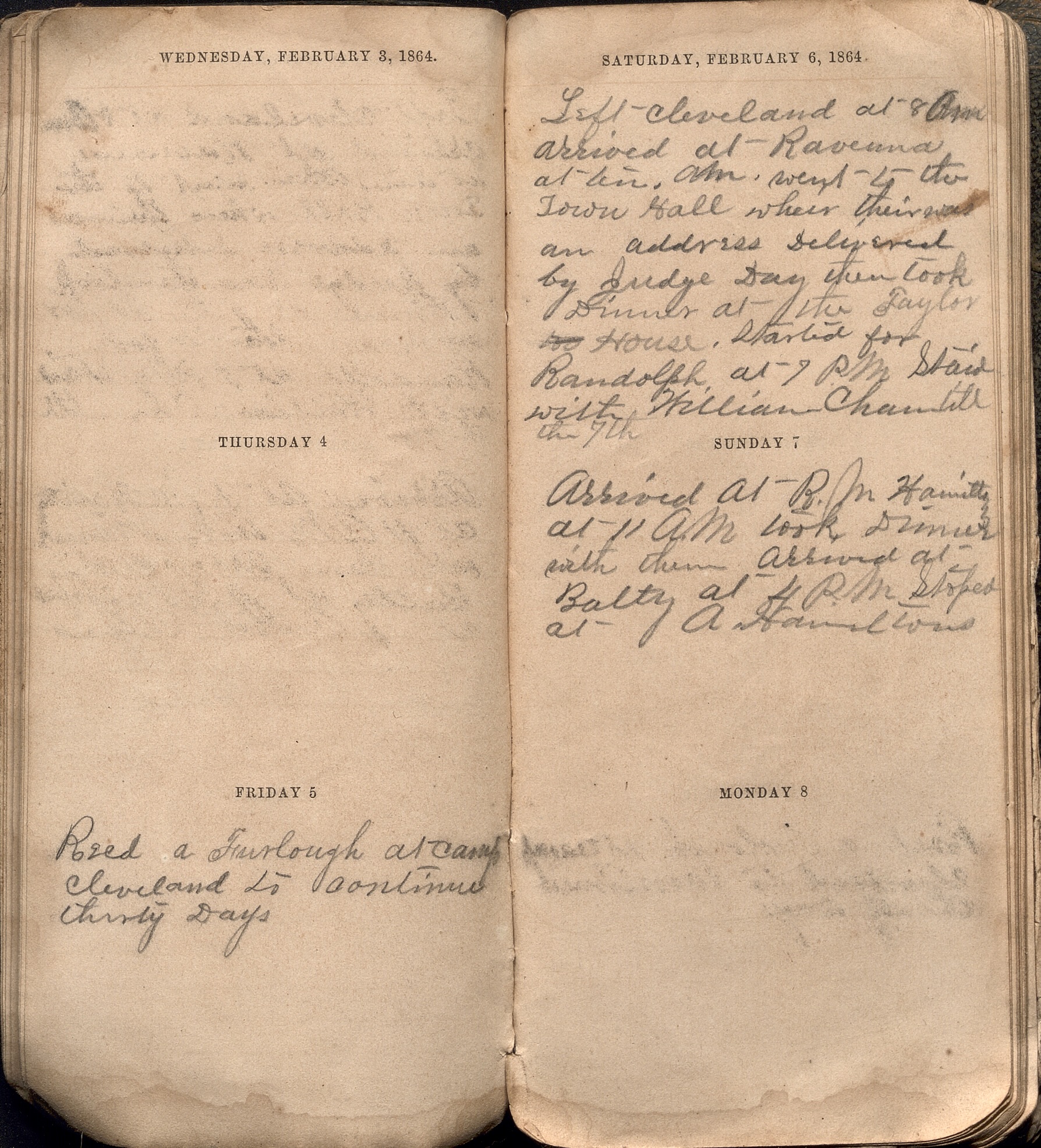Saturday, February 6, 1864—Left Cleveland at 8 a.m. Arrived at Ravenna at ten a.m. Went to the Town Hall where there was an address delivered by Judge Day. Then took dinner at the Taylor House. Started for Randolph at 7 p.m. Stayed with William Ch___ the 7th.
