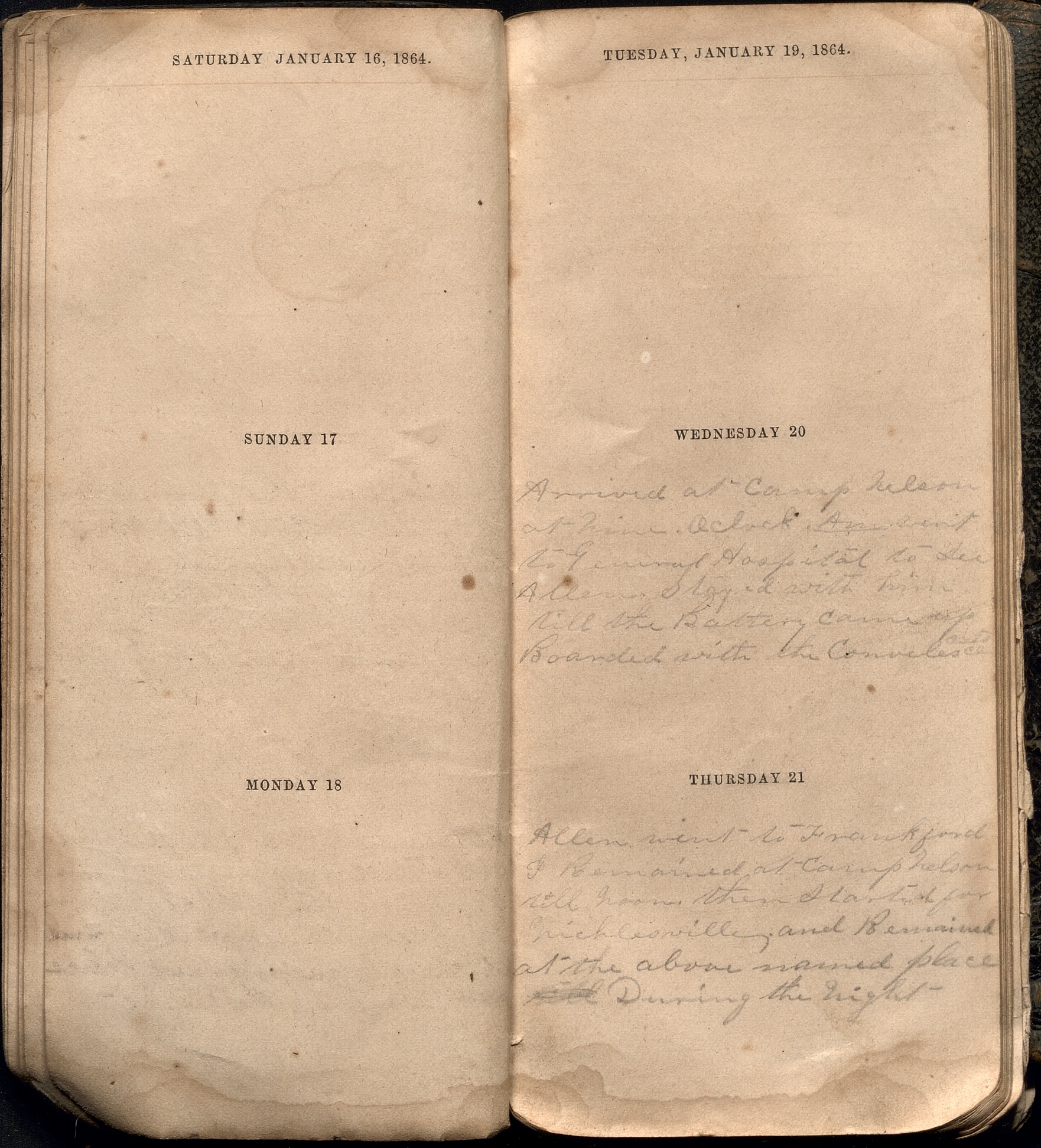 Wednesday, January 20, 1864—Arrived at Camp Nelson at nine o’clock a.m. Went to General Hospital to see [brother] Allen [104th OVI]. Stayed with him till the Battery came up. Boarded with the convalescents.