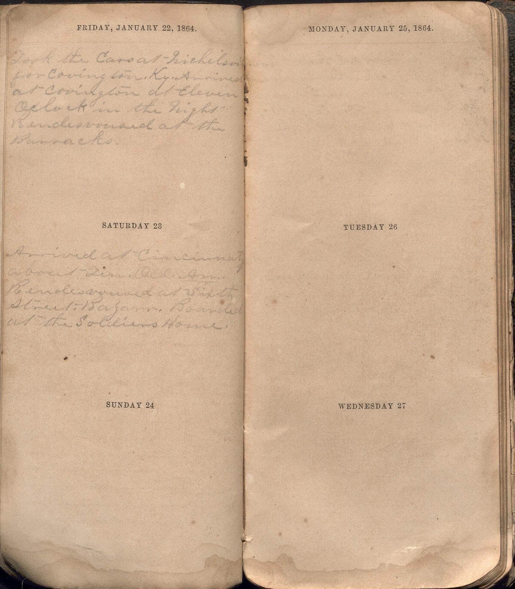 Friday, January 22, 1864—Took the cars at Nicholasville for Covington, Kentucky. Arrived at Covington at 11 o’clock in the night. Rendezvoused at the barracks.