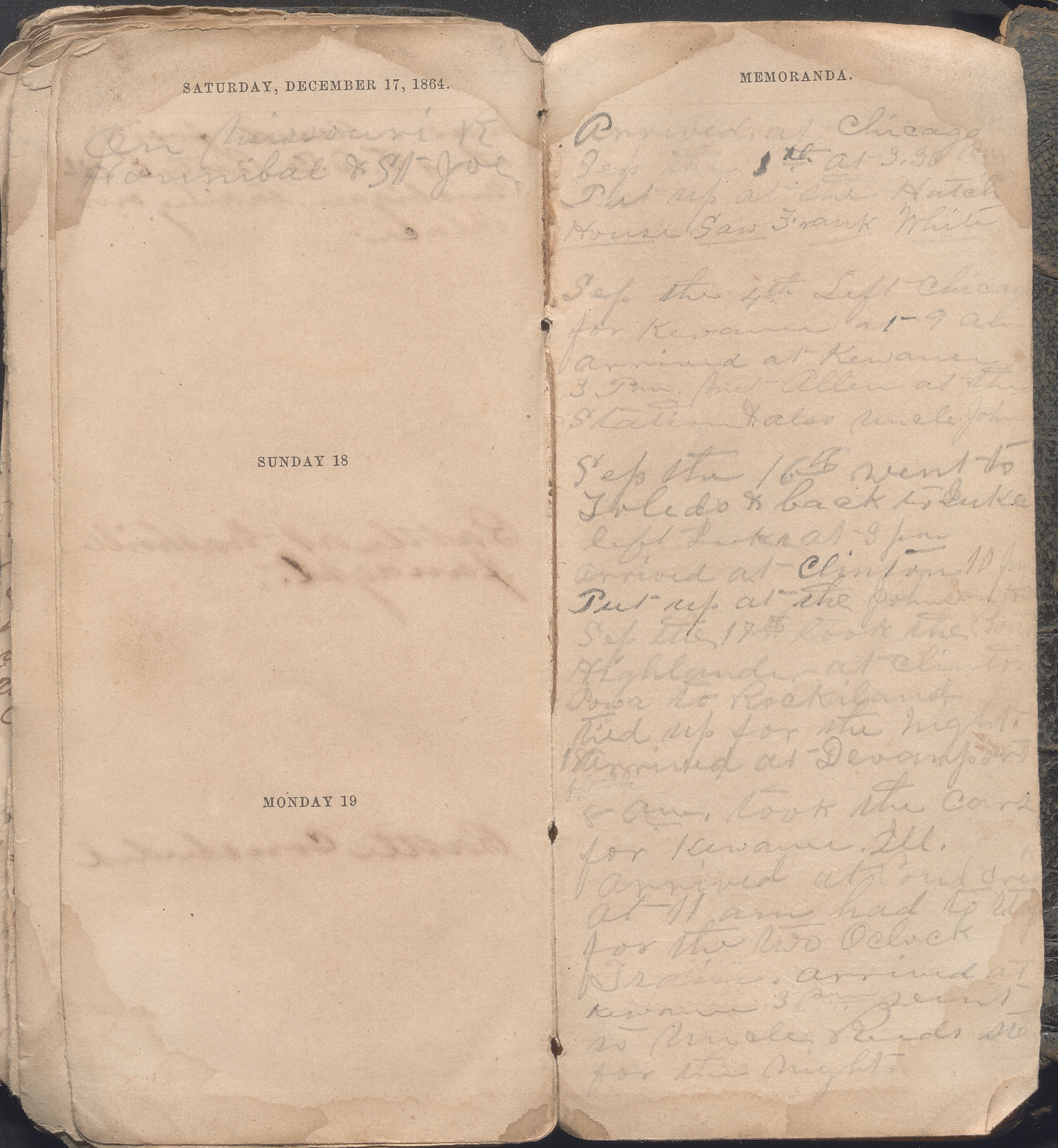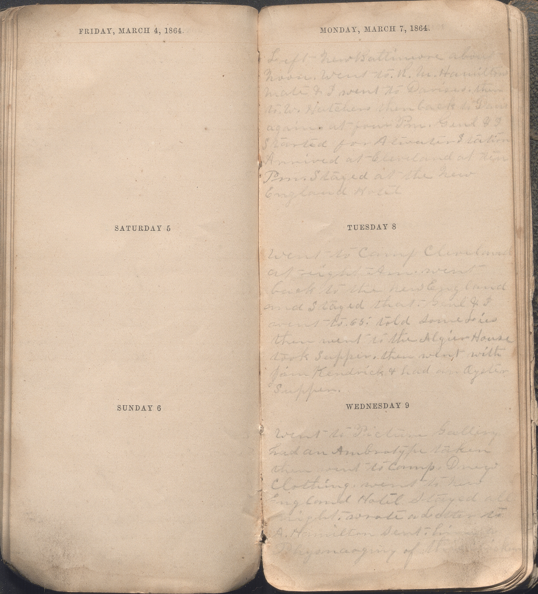 Monday, March 7, 1864—Left New Baltimore about noon. Went to R. M. Hamilton’s. Mate & I went to Davis’s, then to W. Hutchen’s, then back to Davis’s again. At 4 p.m., Genl. & I started for Atwater Station. Arrived at Cleveland at 10 p.m. Stayed at the New England Hotel.