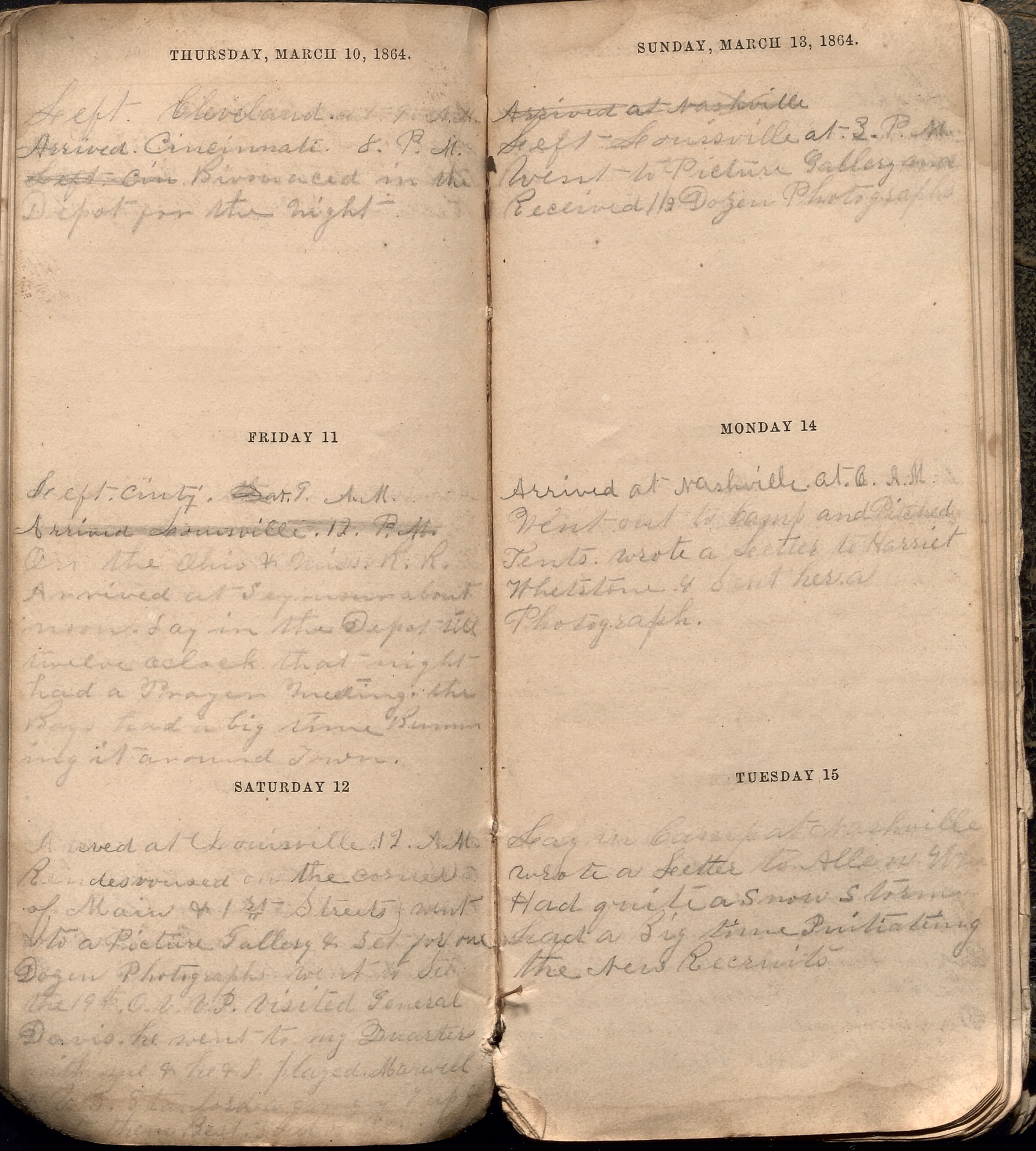 Sunday, March 13, 1864—Left Louisville at 3 p.m. Went to Picture Gallery and received half dozen photographs.