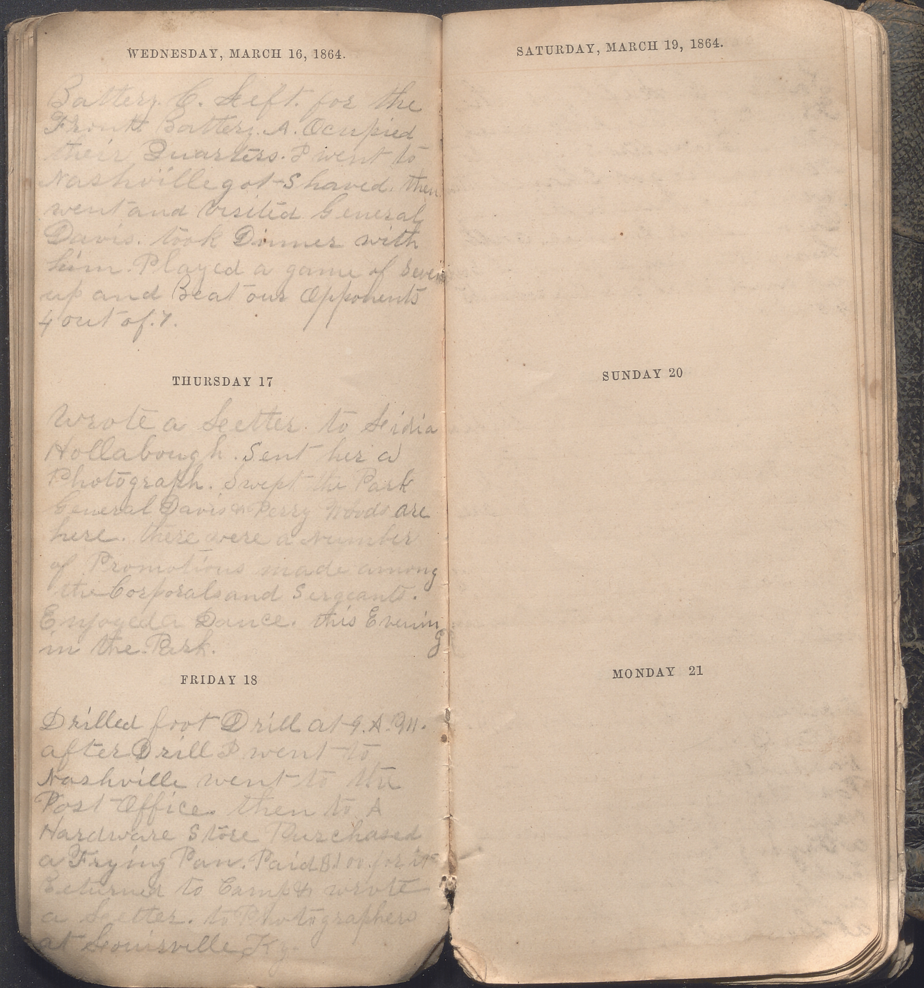 Friday, March 18, 1864—Drilled foot drill at 9 a.m. After drill I went to Nashville. Went to the Post Office. Then to a hardware store. Purchased a frying pan. Paid $1 for it. Returned to camp and wrote a letter to photographers at Louisville, Ky.