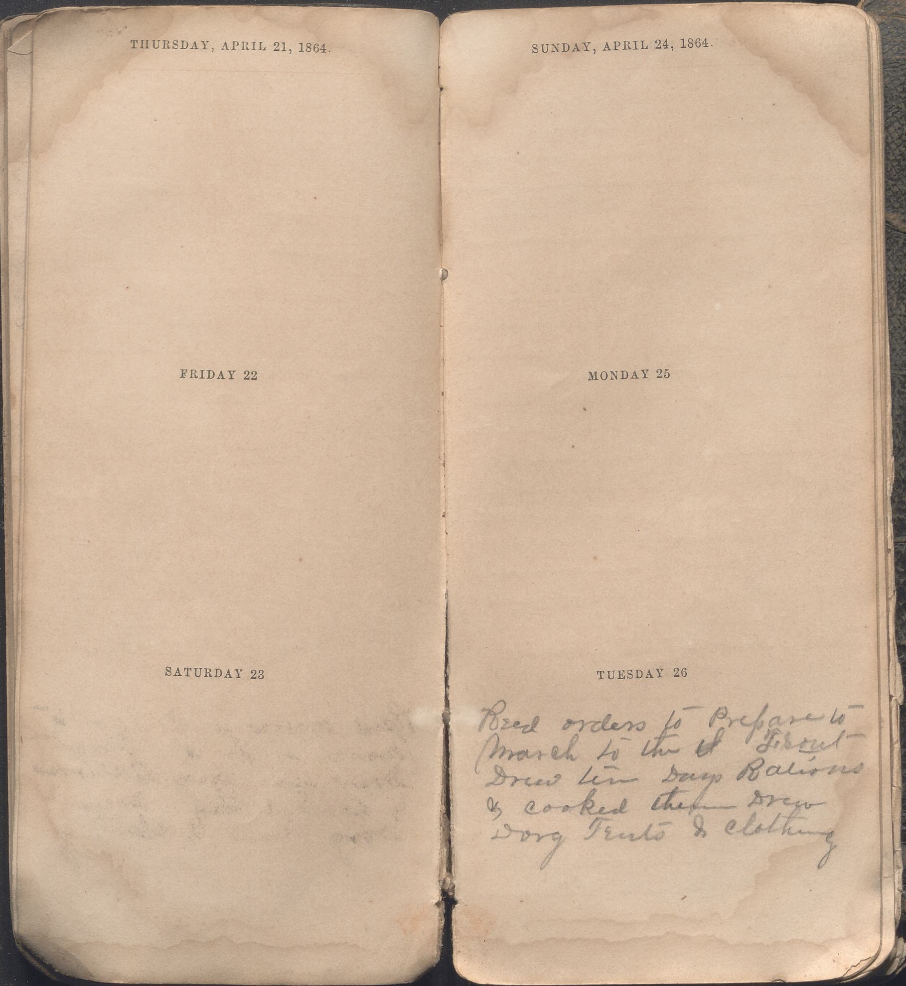 Tuesday, April 26, 1864—Received orders to prepare to march to the front. Drew ten days rations & cooked them. Drew dog tents and clothing.