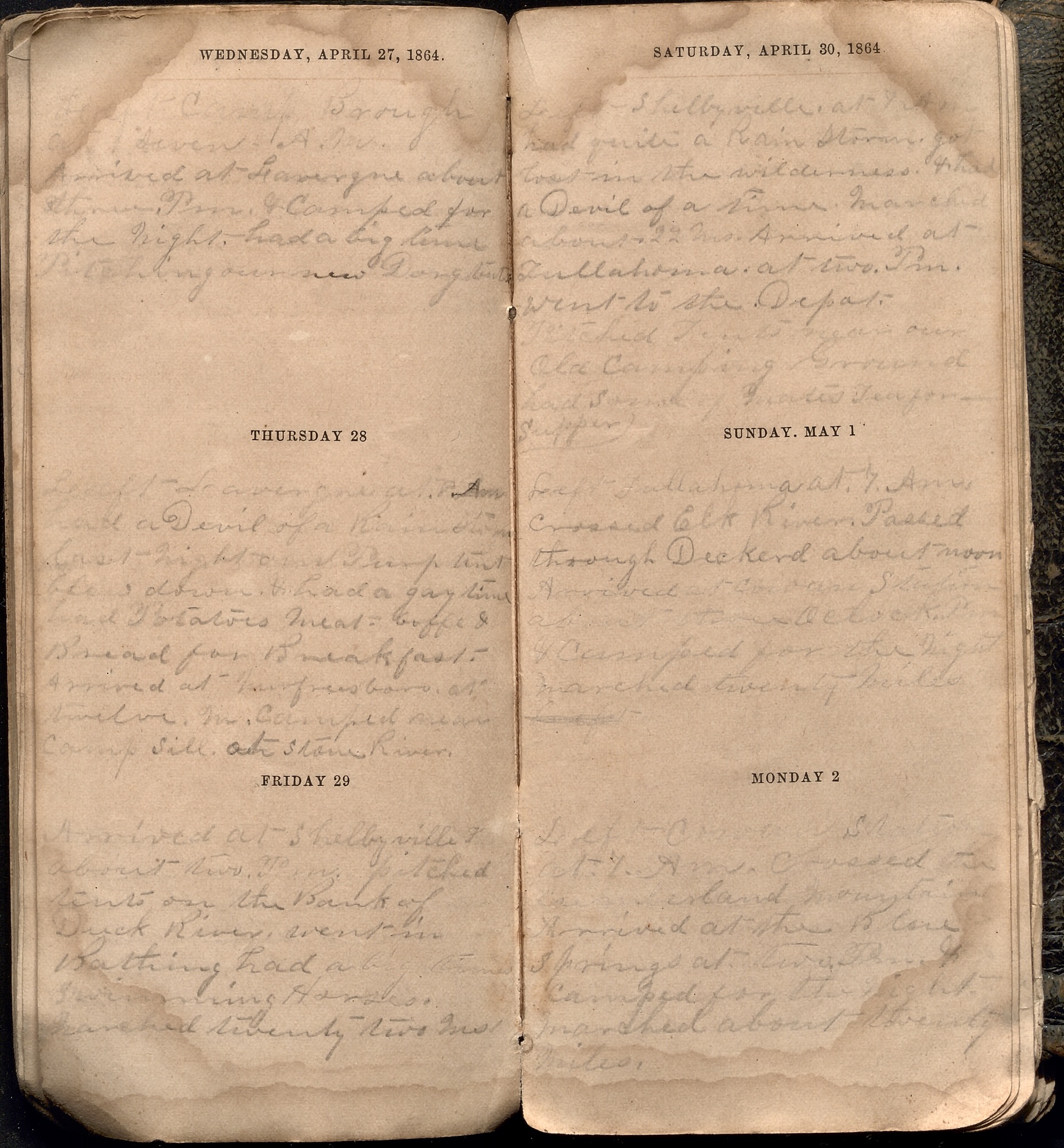 Friday, April 29, 1864—Arrived at Shelbyville about 2 p.m. Pitched tents on the bank of Duck River. Went in bathing. Had a big time swimming horses. Marched 22 miles.