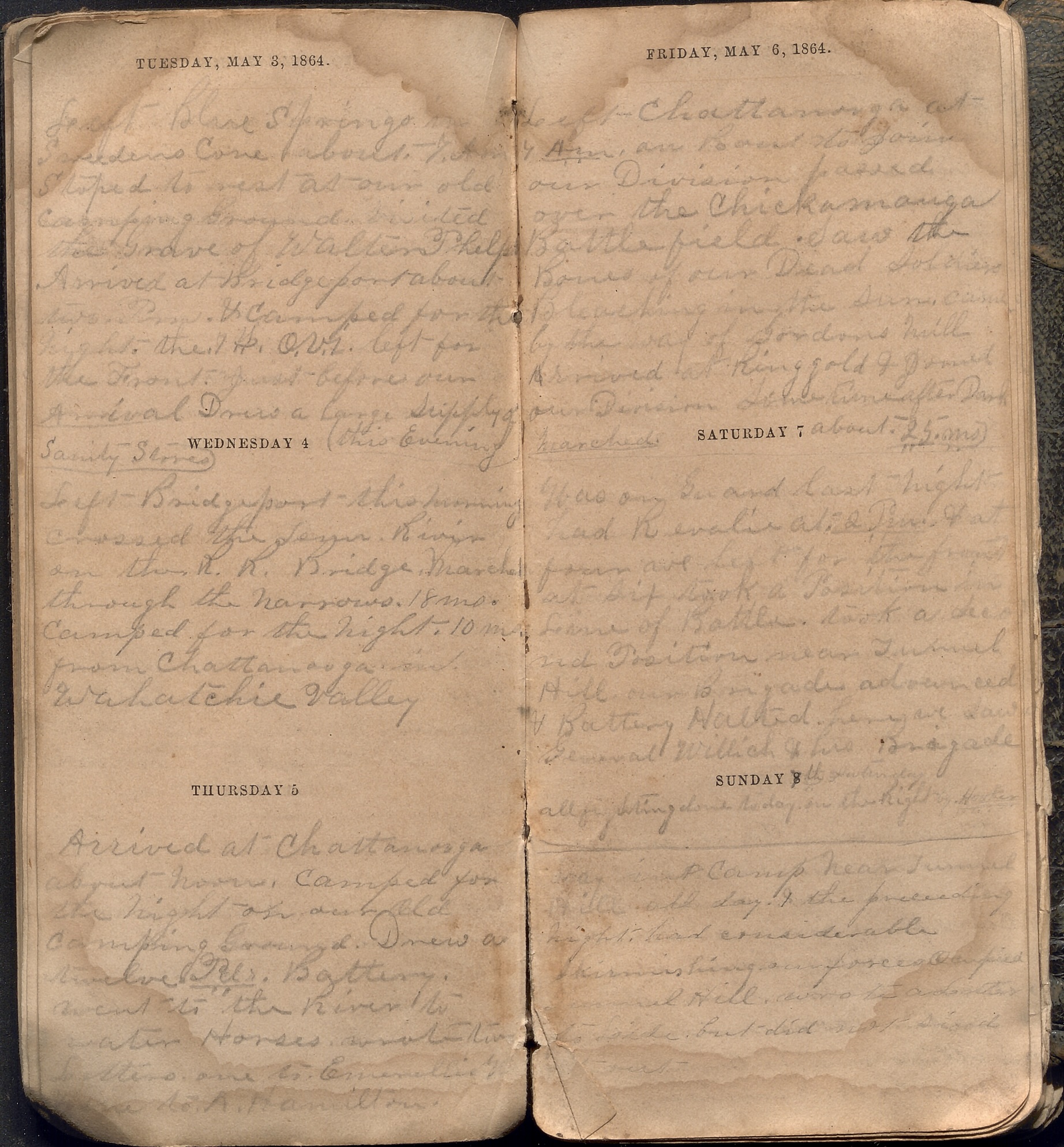 Friday, May 6, 1864—Left Chattanooga at 7 a.m. on road to join our Division. Passed over the Chickamauga Battlefield. Saw bones of our dead soldiers bleaching in the sun. Came by the way of Gordon’s Mill. Arrived at Ringgold & joined our Division sometime after dark. Marched about 25 miles.