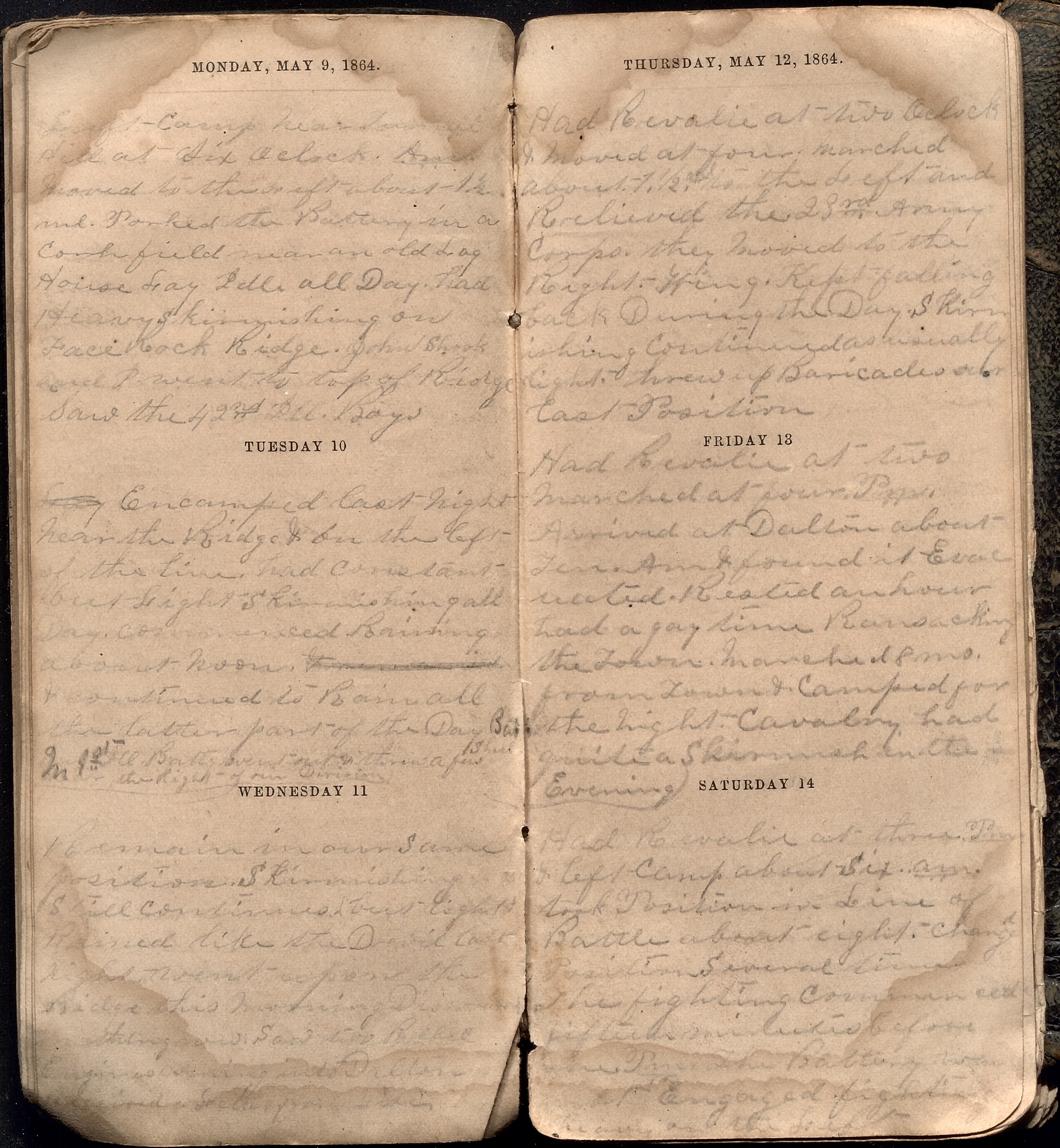 Saturday, May 14, 1864—Had reveille at 3 a.m. Left camp about 6 a.m. Took position in line of battle about eight. Changed position several times. The fighting commenced fifteen minutes before one p.m. The Battery was not engaged. Fighting heavy on the left.