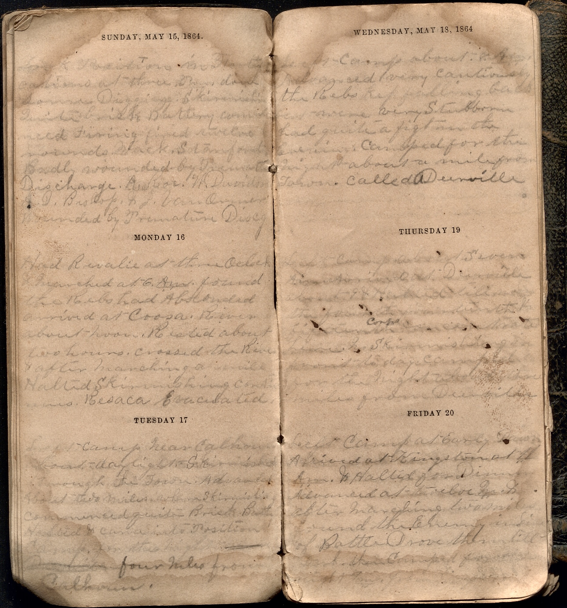 Wednesday, May 18, 1864—Left camp about 8 a.m.. Advanced very cautiously. The Rebs falling back but were very stubborn. Had quite a fight in the evening. Camped for the night about a mile from town called Deerville.
