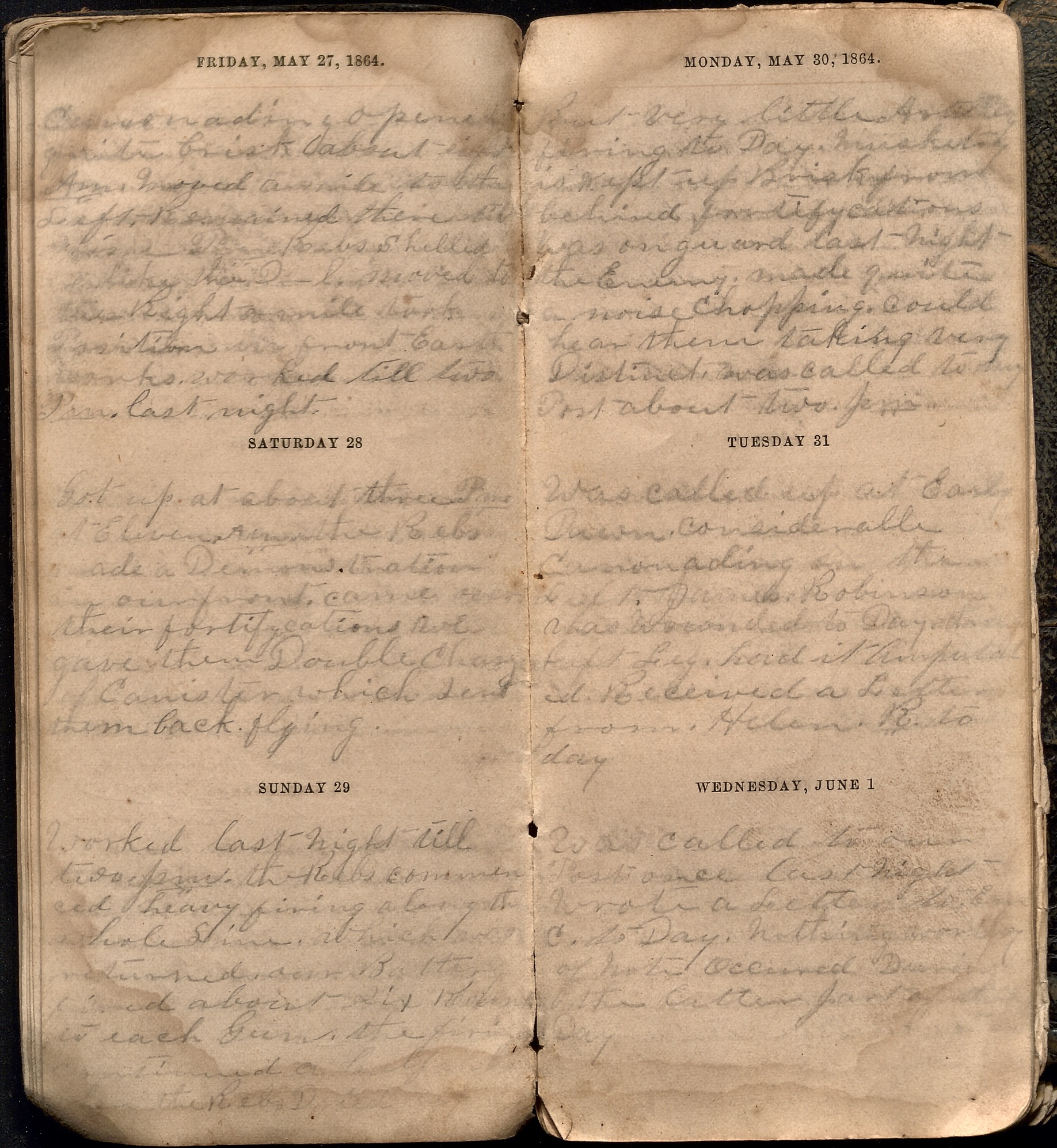 Saturday, May 28, 1864—Got up at about 3 a.m. At 11 a.m., the Rebs made a demonstration in our front. Came over their fortifications. We gave them double charge of canister which sent them back flying.