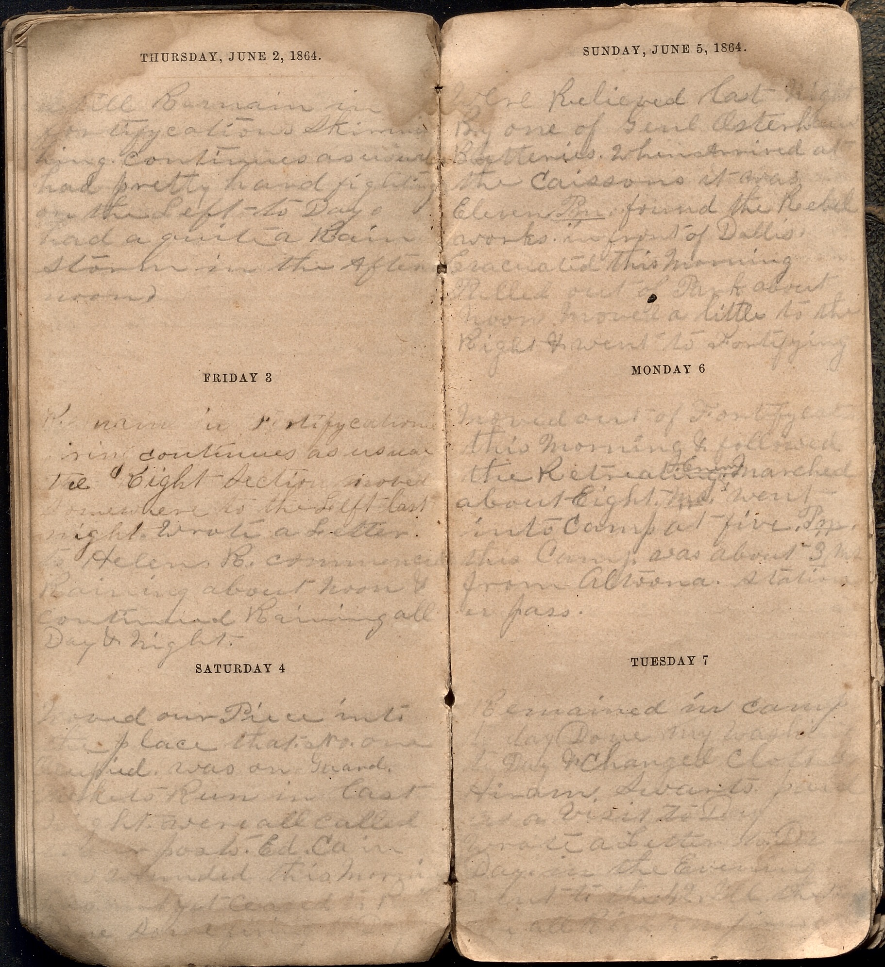 Thursday, June 2, 1864—Still remain in fortifications. Skirmishing continues as usual. Had pretty hard fighting on the left today. Had quite a rain storm in the afternoon.