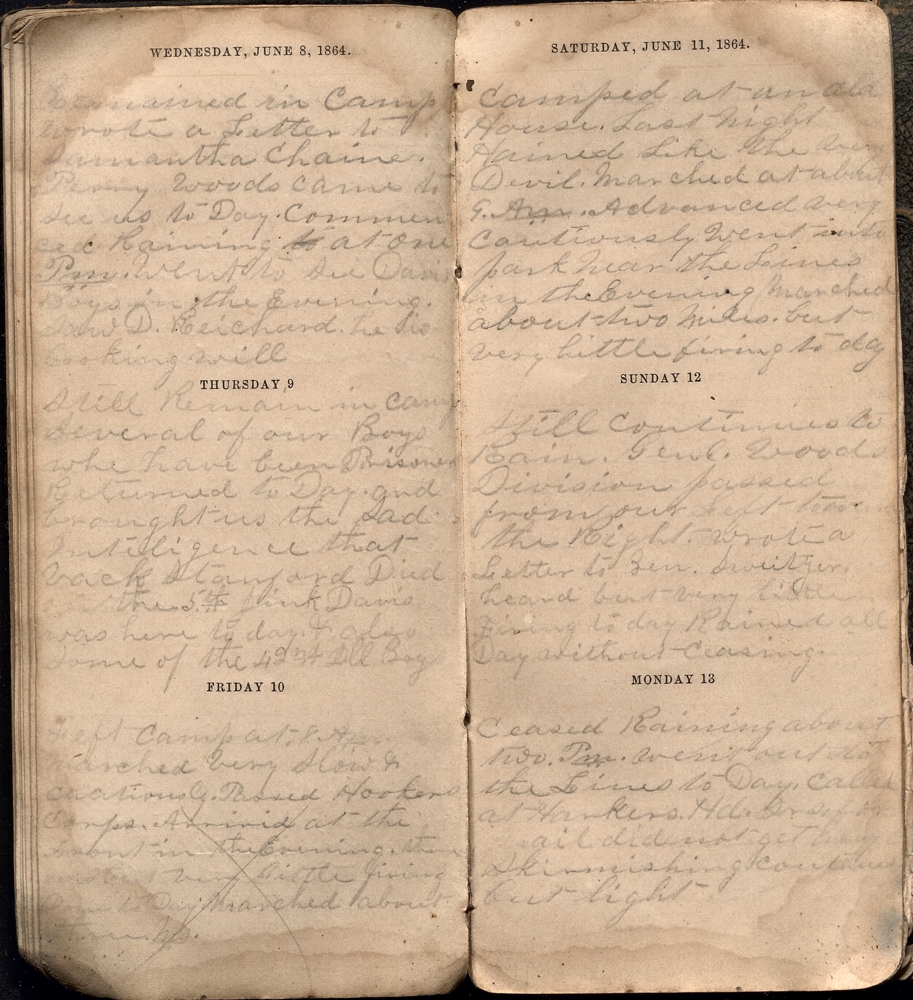 Saturday, June 11, 1864—Camped at an old house last night. Rained like the very devil. Marched at about 9 a.m. Advanced very cautiously. Went into park near the lines in the evening. Marched about two miles but very little firing today.