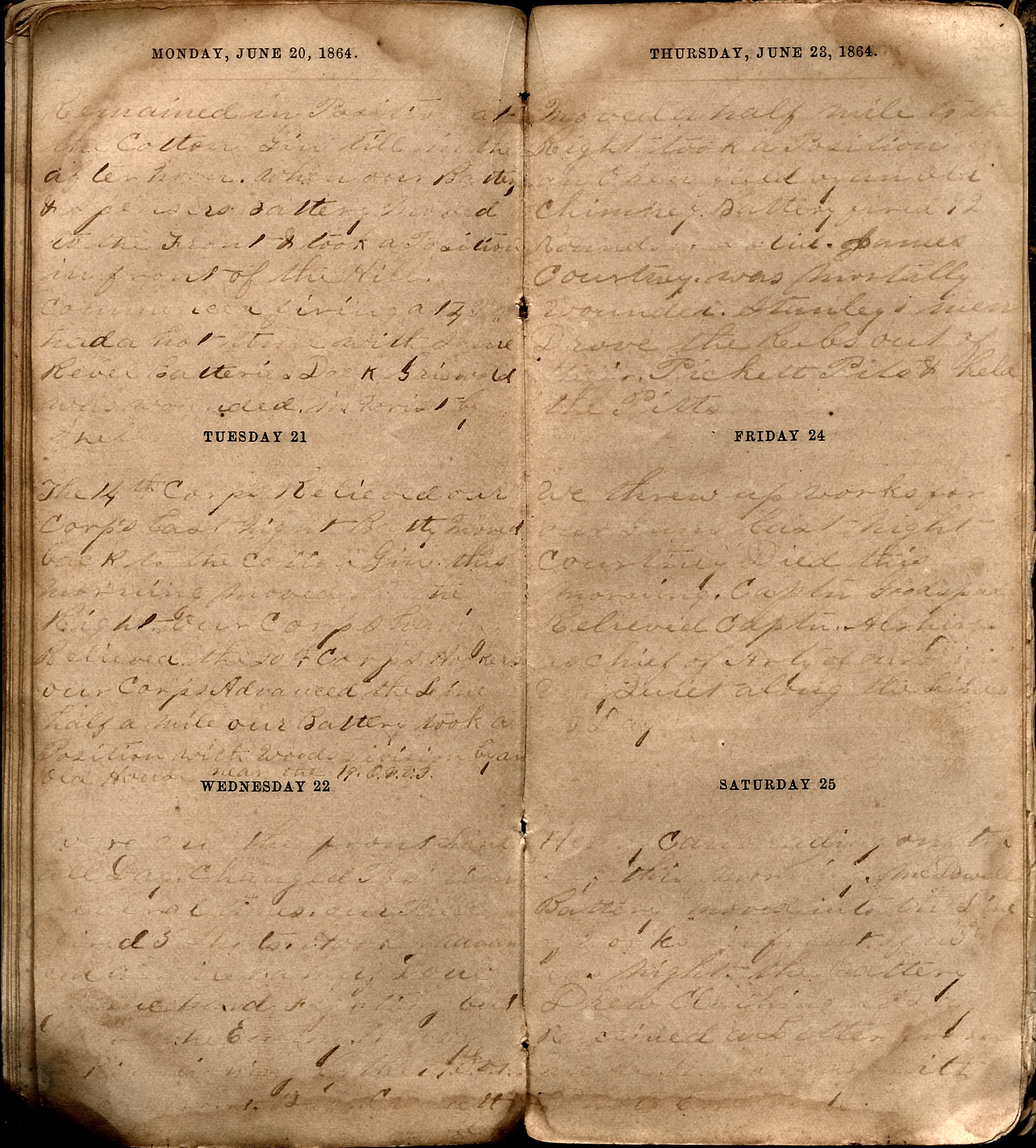 Friday, June 17, 1864—Was on guard last night. Our skirmishers advanced at early dawn & found the Rebel works evacuated. Battery moved at 8 a.m. Heavy skirmishing & cannonading commenced at noon. At 5 p.m. the Battery came to position at an old house a little [ ] Brigade. Fired 20 rounds to a gun.