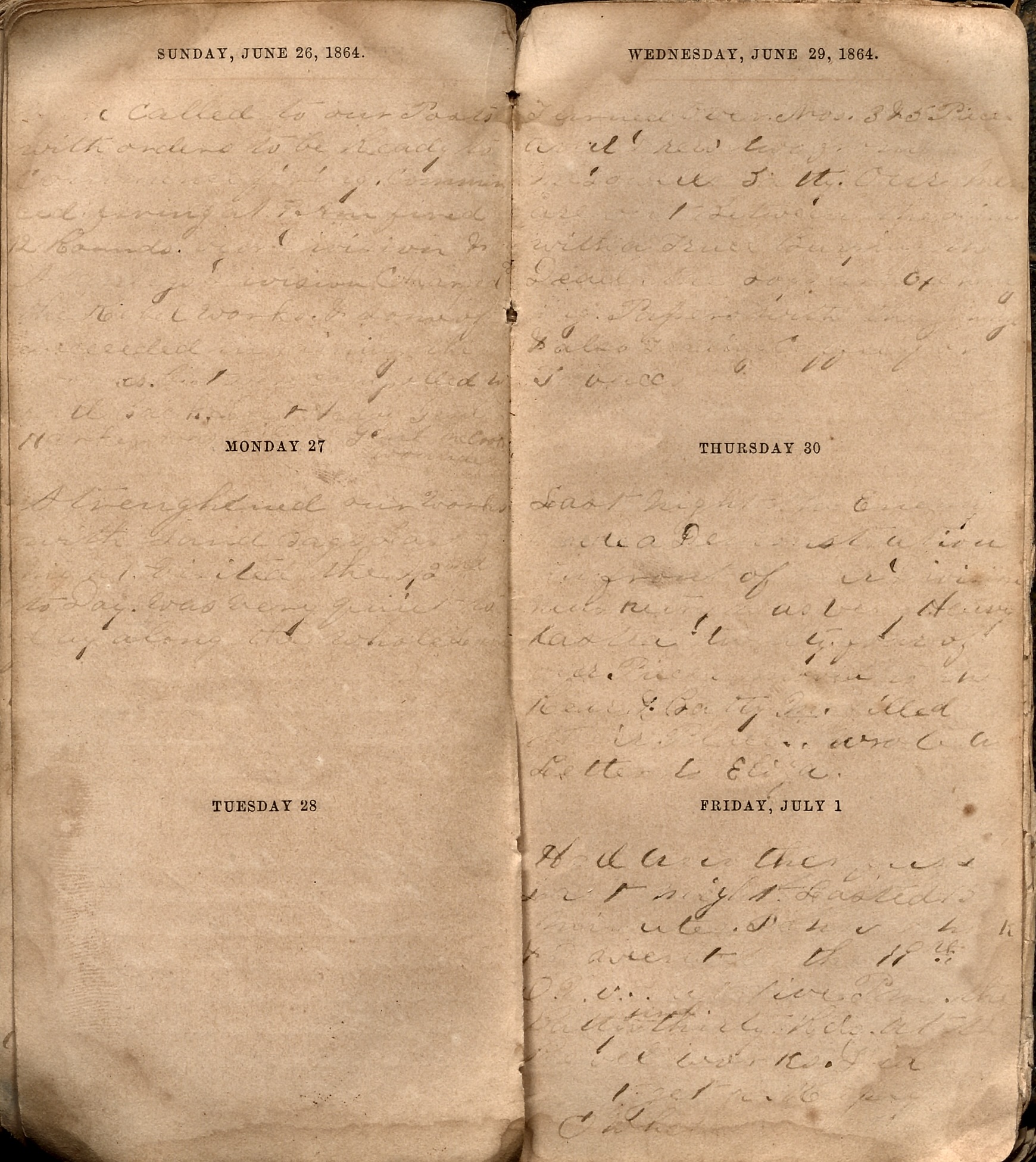 Monday, July 25, 1864—Rebs done considerable cannonading last night. Could hear them fighting on the Right Wing at 12 o’clock last night. Built a line of works in front. Cannoneers built embrasures. Moved into the works at 4 p.m.