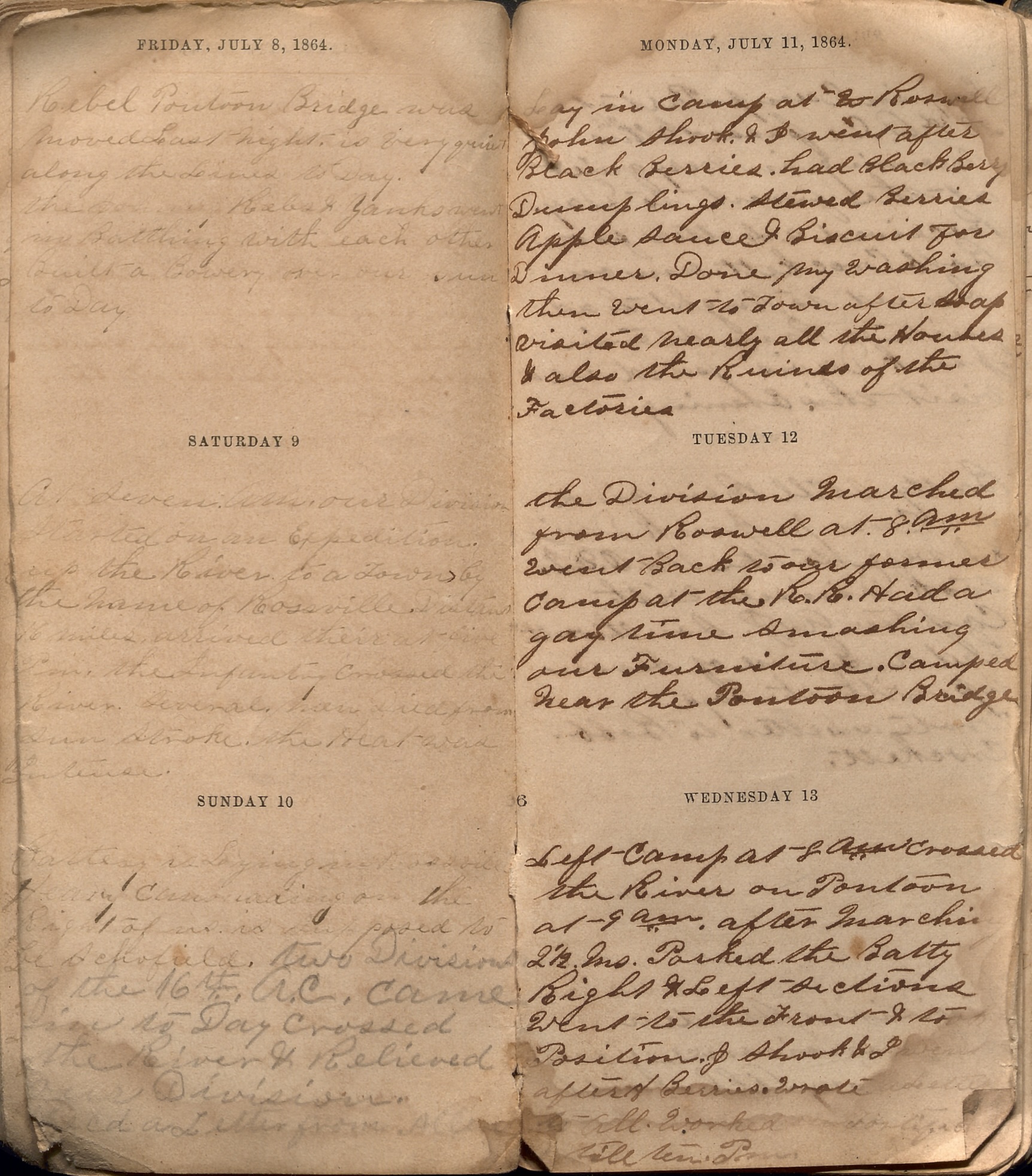 Wednesday, July 13, 1864—Left camp at 8 a.m., crossed the river on pontoon [bridge] at 9 a.m. After marching 2.5 miles, parked the Battery. Right and Left sections went to the front and took position. John Shook and I went after berries. Wrote letter to Ell. Worked on fortifications till ten p.m.