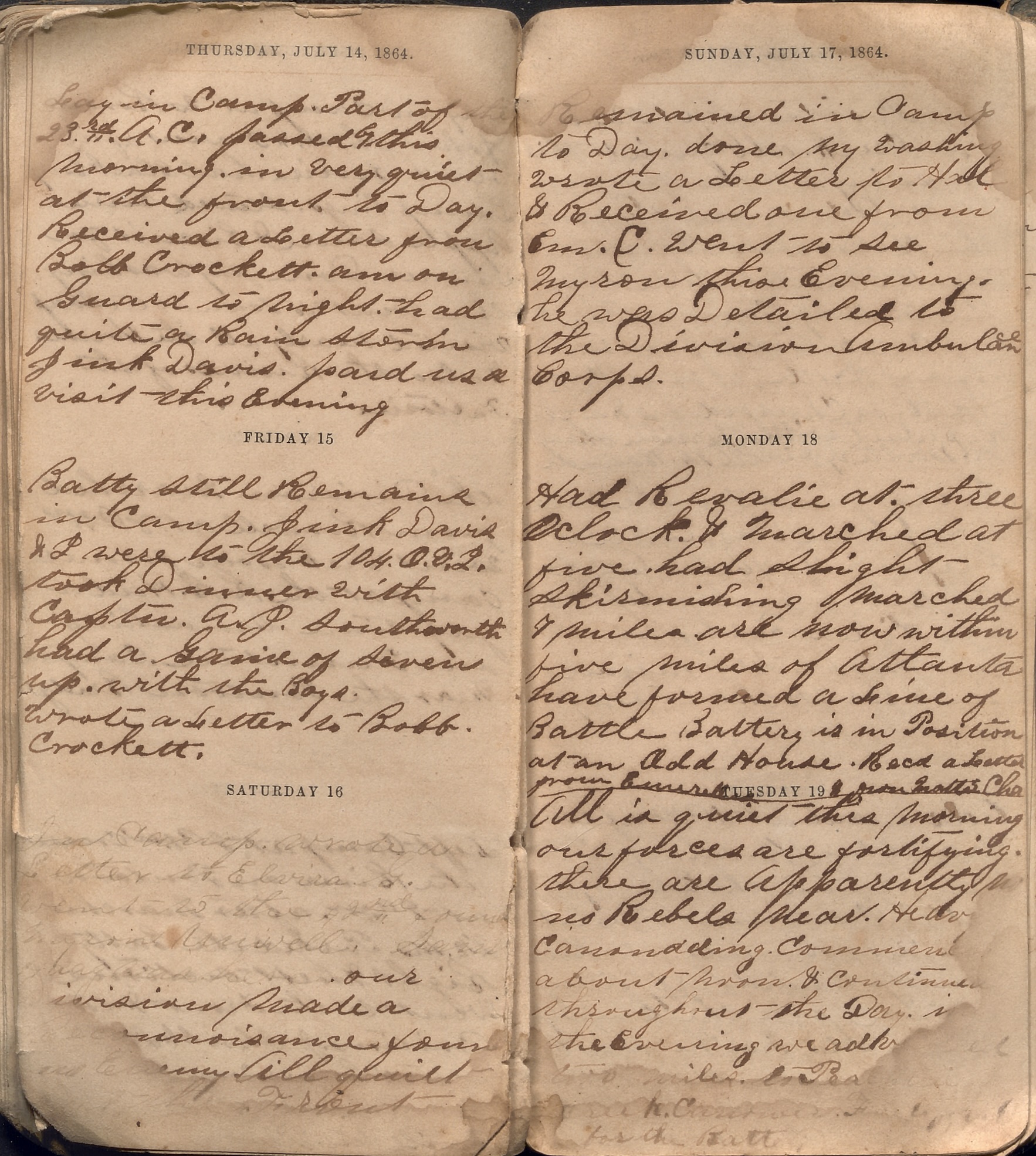Monday, July 18, 1864—Had reveille at 3 o’clock. Marched at 5 Had slight skirmishing. Marched 7 miles. Are now within 5 miles of Atlanta. Have formed a line of battle. Battery is in position at an old house. Received a letter from [ ].