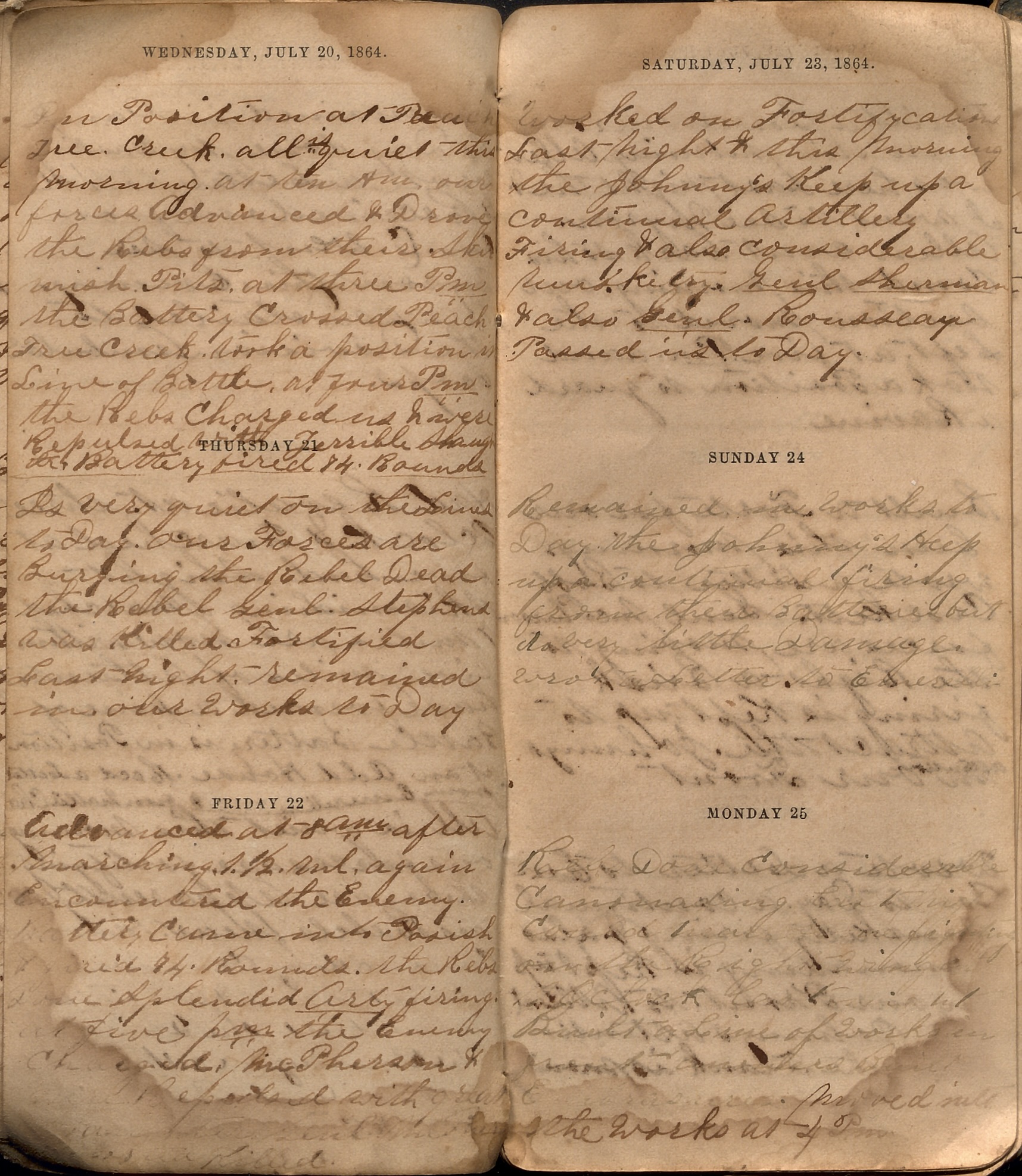 Wednesday, July 20, 1864—In position at Peach Tree Creek. All is quiet this morning. At 10 a.m., our forces advanced & drove the Rebs from their skirmish pits. At 3 p.m., the Battery crossed Peach Tree Creek [and] took a position in line of battle. At 4 p.m., the Rebs charged us & were repulsed with terrible slaughter. Battery fired 74 rounds.