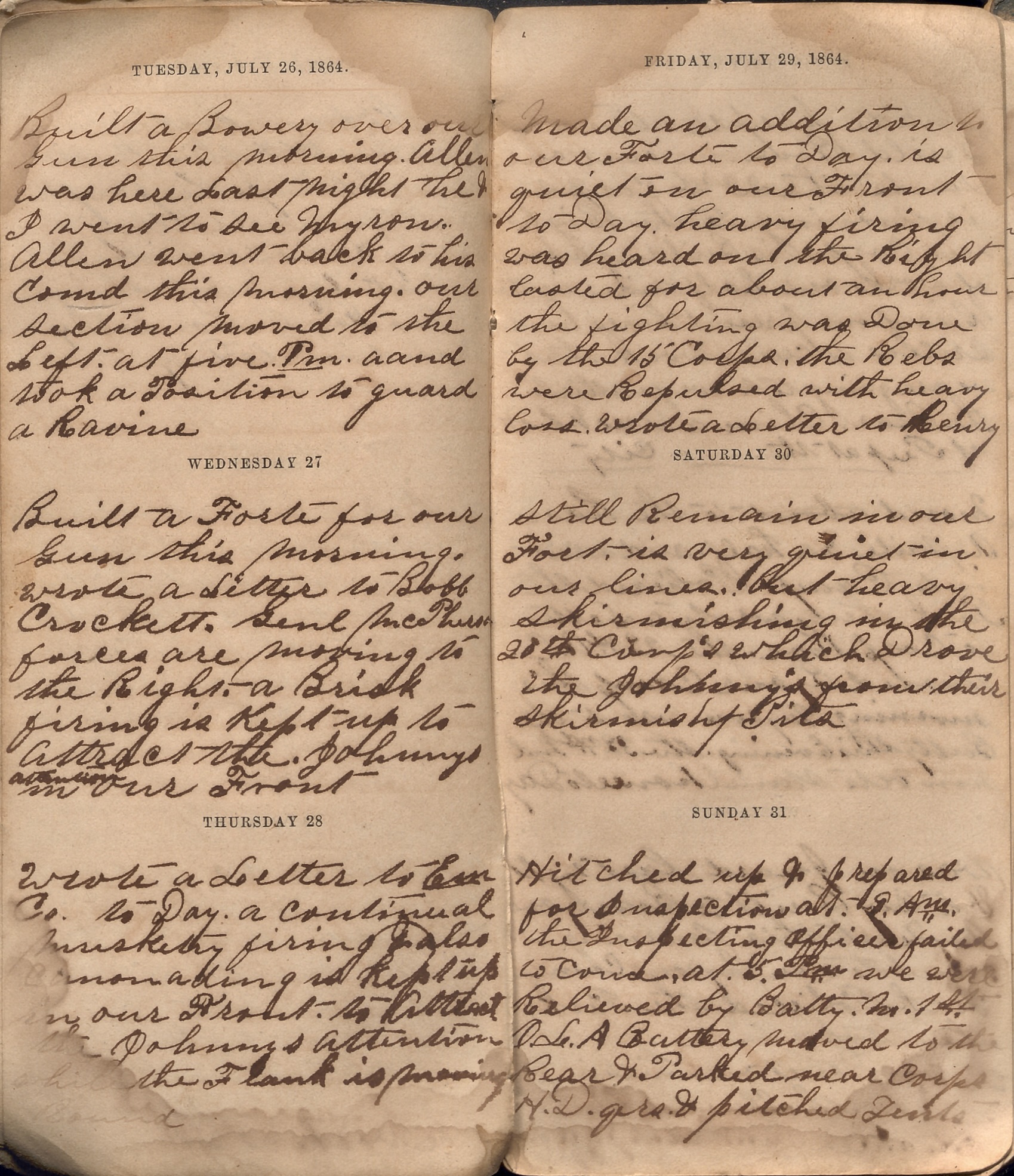 Wednesday, July 27, 1864—Built a fort for our gun this morning. Wrote a letter to Bobb Crockett. Gen. McPherson’s forces are moving to the right. A brisk firing is kept up to attract the Johnnies’ attention in our front.