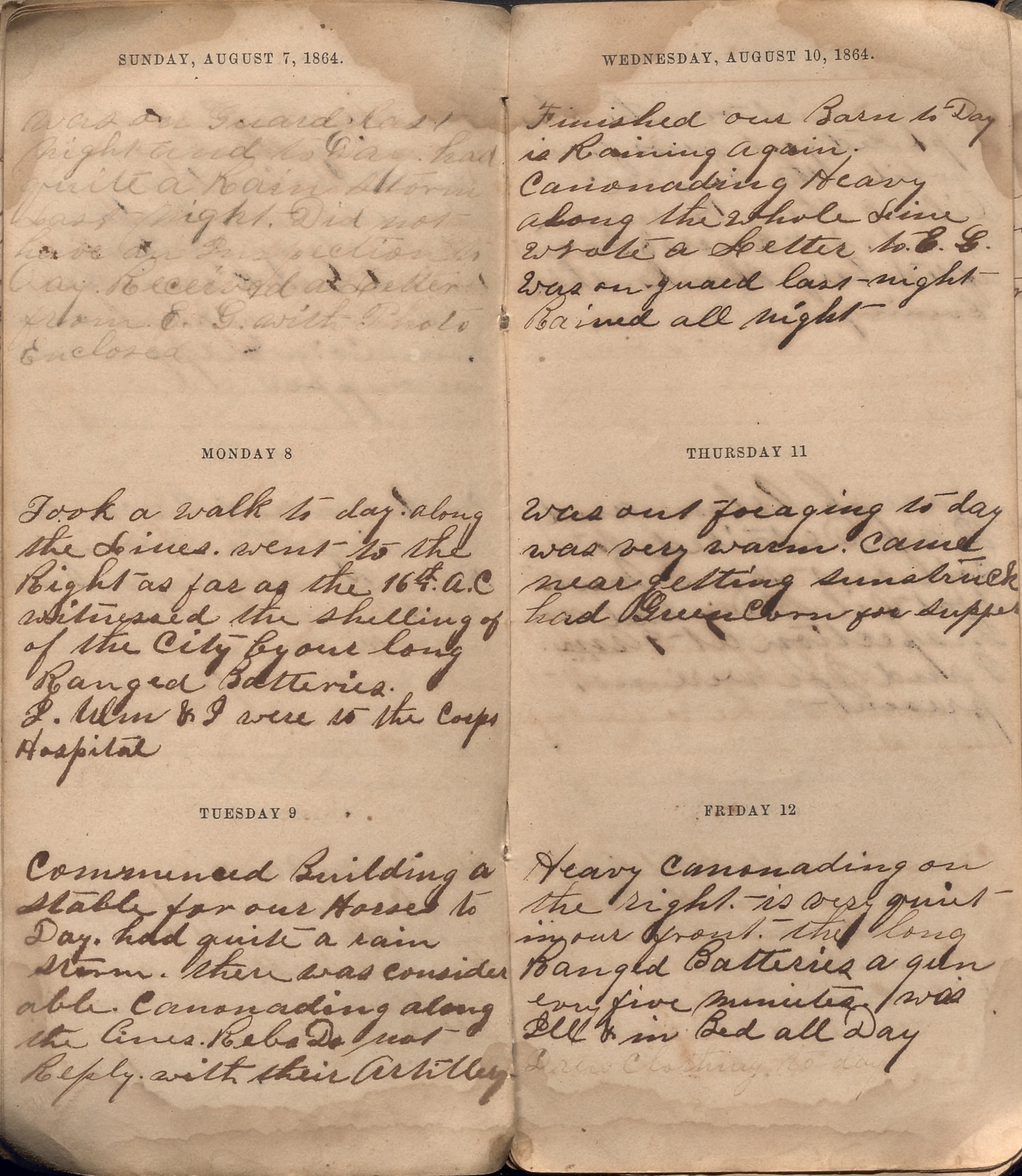 Friday, August 12, 1864—Heavy cannonading on the right. Is very quit in our front. The long ranged batteries [fire] a gun every five minutes. Was ill and in bed all day.