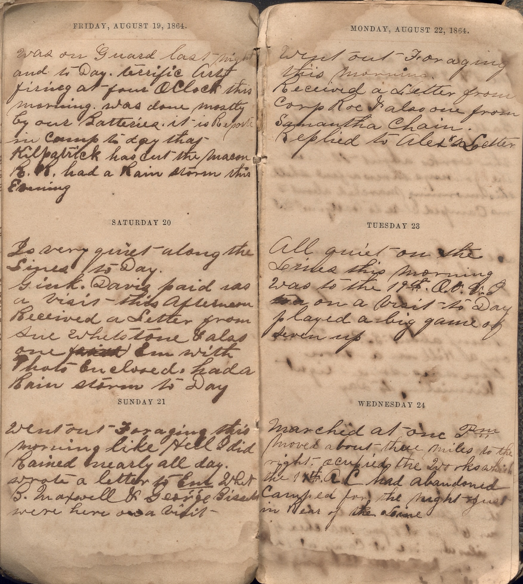 Monday, August 22, 1864—Went out foraging this morning. Received a letter from Corp. Roe and also one from Samantha Chain. Replied to Alex’s letter.