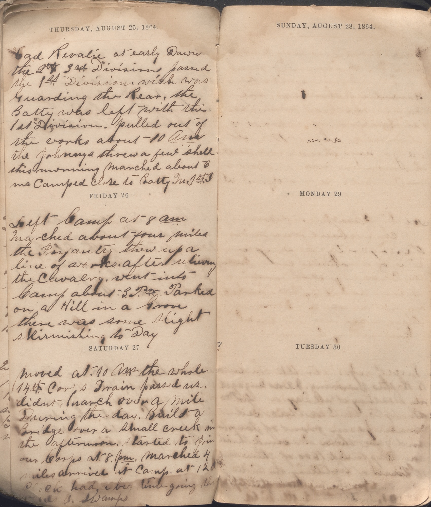 Saturday, August 27, 1864—Moved at 10 a.m. The whole 14th Corps train passed us. Didn’t march over a mile during the day. Built a bridge over a small creek in the afternoon. Started to join our Corps at 8 p.m. Marched 4 miles. Arrived at camp at 12 o’clock. Had a big time going through a swamp.