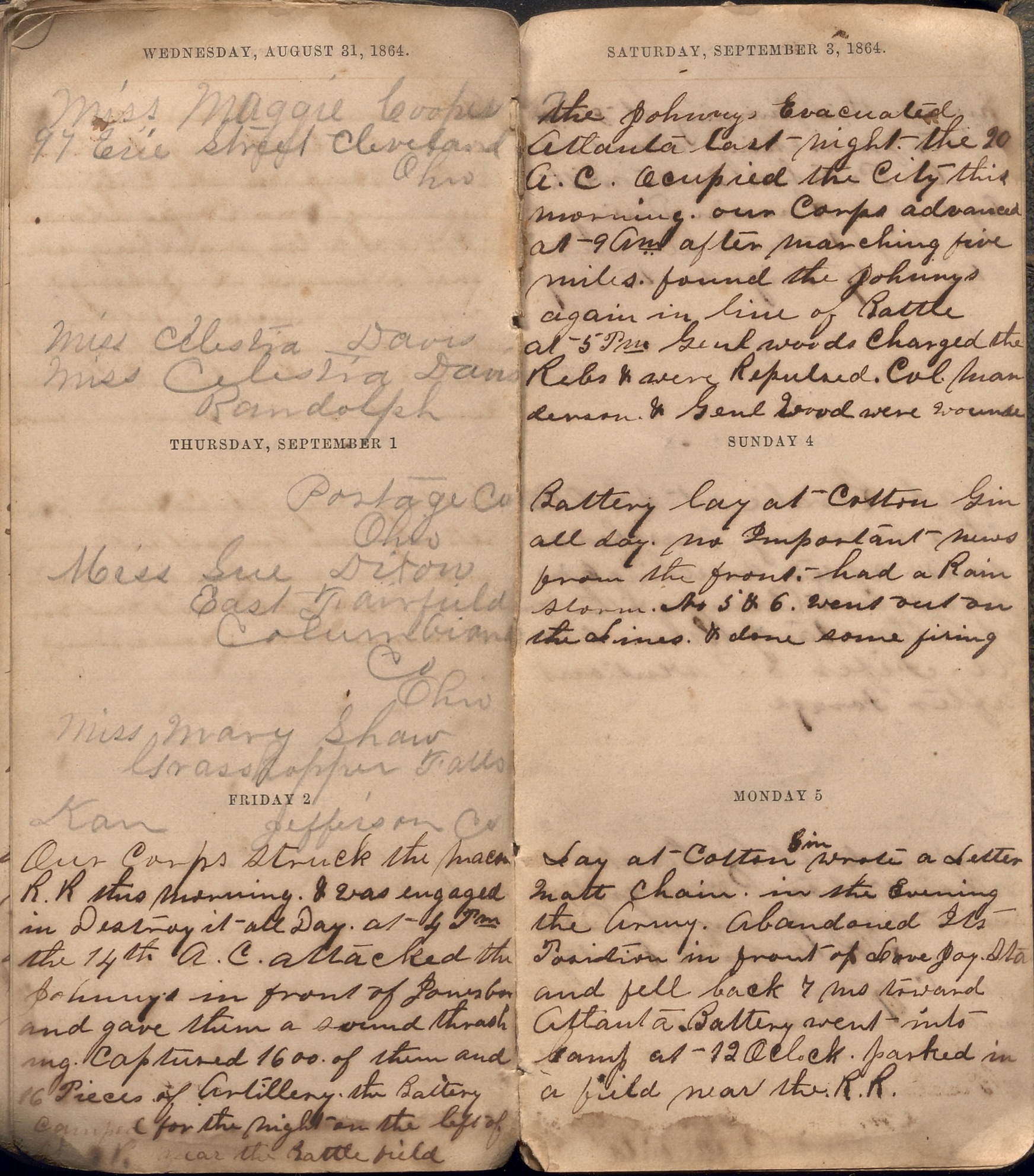 Friday, September 2, 1864—Our Corps struck the Macon Railroad this morning & was engaged in destroying it all day. At 4 p.m. the 14th Army Corps attacked the Johnnies in front of Jonesboro and gave them a sound thrashing. Captured 1600 of them and 16 pieces of artillery. The Battery camped for the night on the left of the RR near the battlefield.