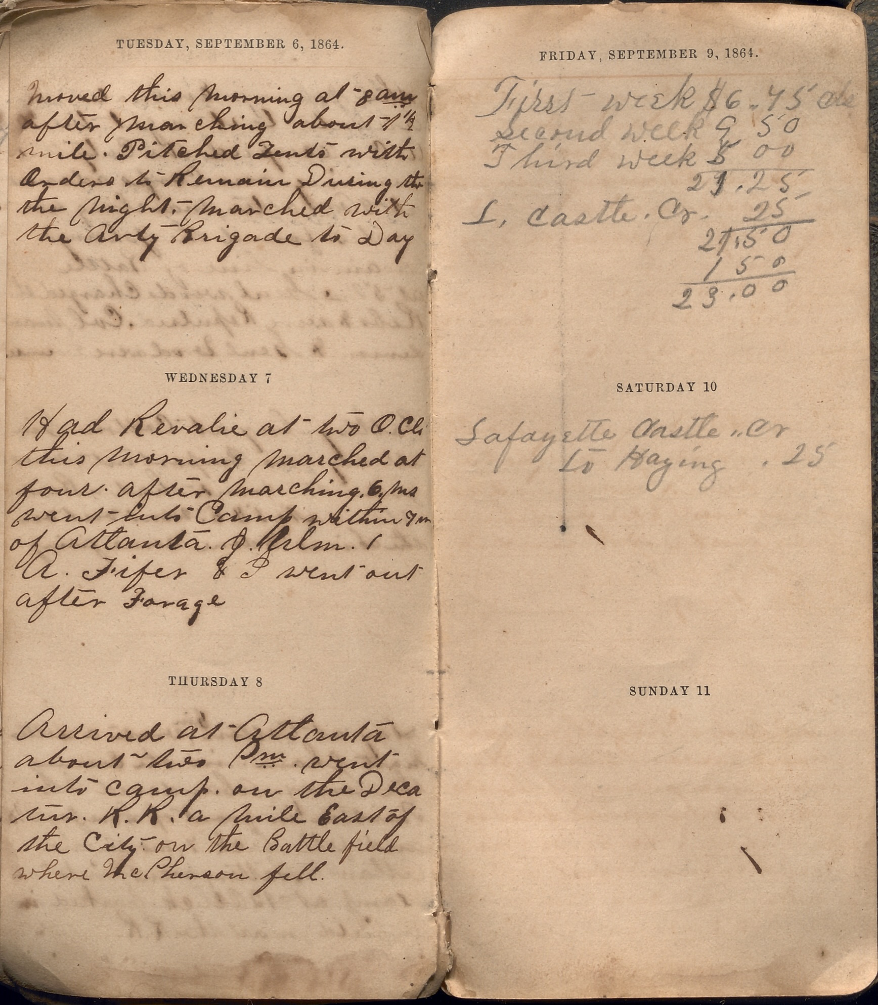 Wednesday, September 7, 1864—Had reveille at 2 o’clock this morning. Marched at 4. After marching 6 miles, went into camp within 7 miles of Atlanta. Joseph Ulm, Jacob Fifer, and I went out after forage.