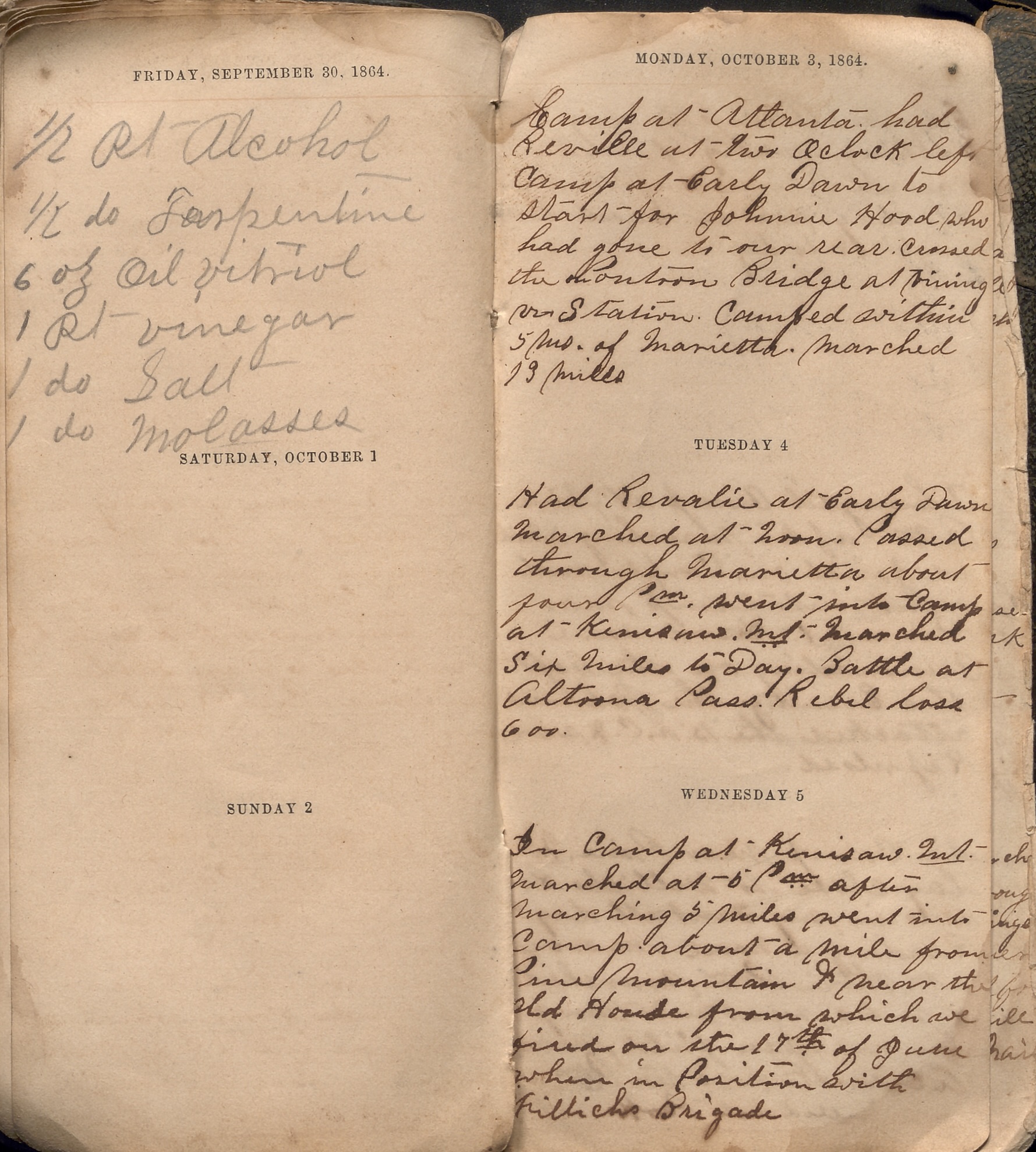 Tuesday, October 4, 1864—Had reveille at early dawn. Marched at noon. Passed through Marietta about 4 p.m. Went into camp at Kennesaw Mountain. Marched 6 miles today. Battle at Altoona Pass. Rebel loss 600.