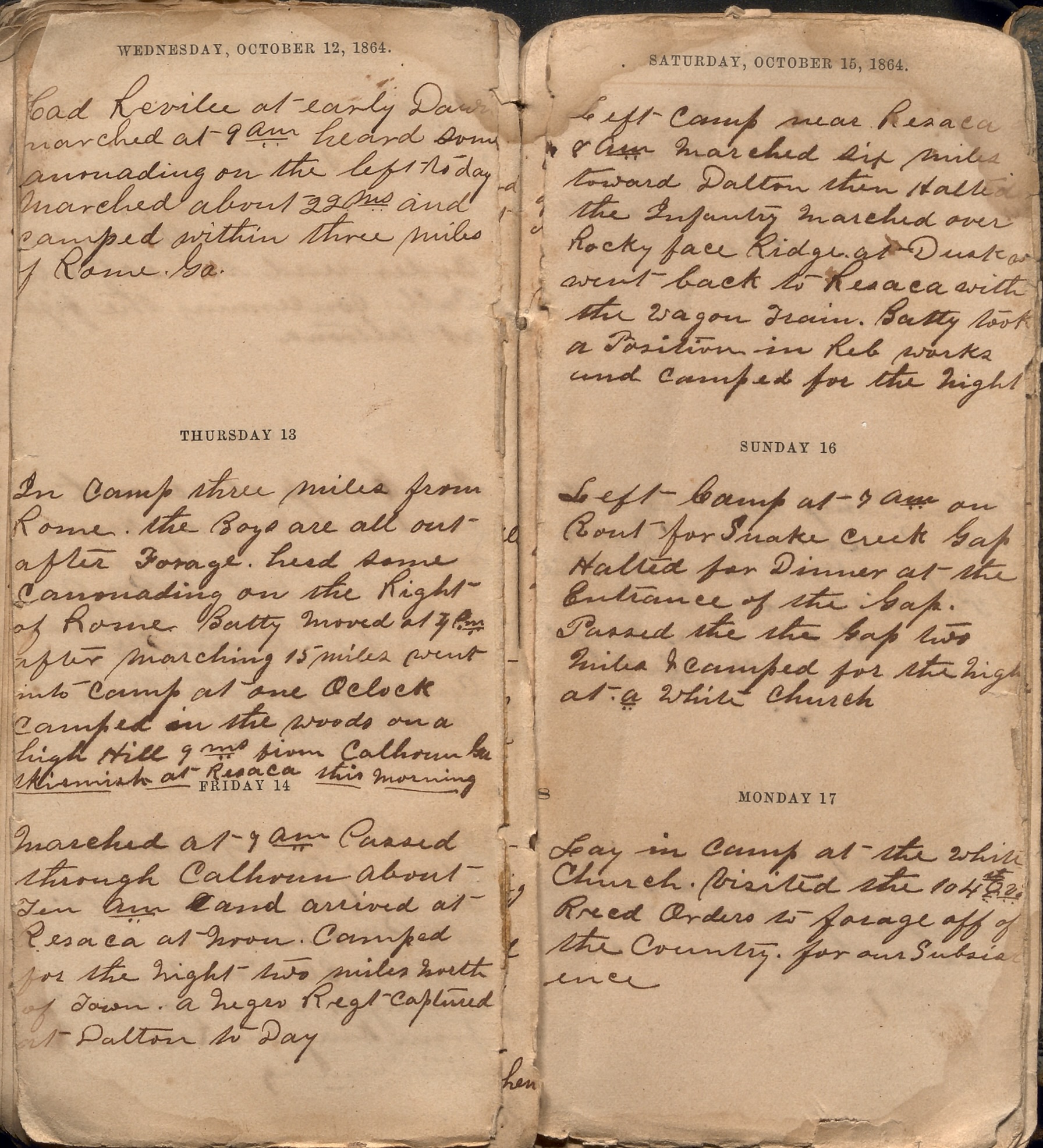 Thursday, October 13, 1864—In camp three miles from Rome. The Boys are all out after forage. Heard some cannonading on the right of Rome. Battery moved at 4 p.m. After marching 15 miles, went into camp at one o’clock. Camped in the woods on a high hill 9 miles from Calhoun, Georgia. Skirmish at Resaca this morning.