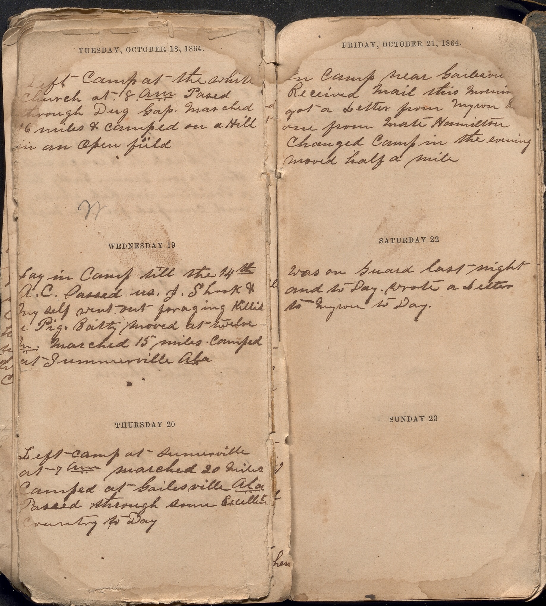 Friday, October 21, 1864—In camp near Gaylesville. Received mail this morning. Got a letter from Myron and one from Mate Hamilton. Changed camp in the evening. Moved half a mile.