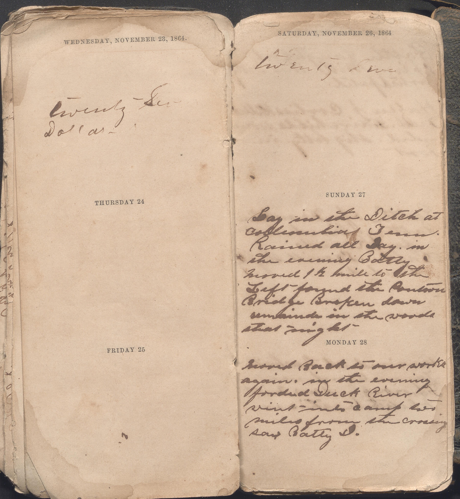 Sunday, November 27, 1864—Lay in ditch at Columbia, Tennessee. Rained all day. In the evening, Battery moved 1.5 miles to the left. Found the pontoon bridge broken down. Remained in the woods that night.