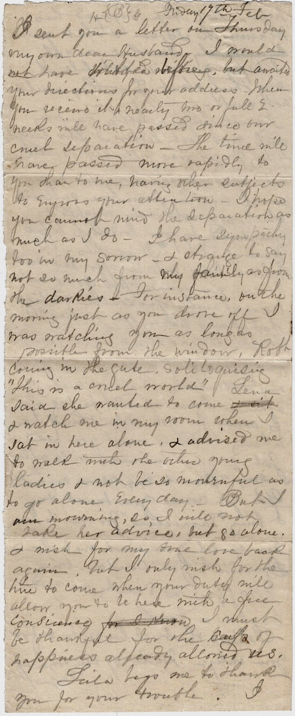 I would not have written before but awaited your directions for your address. When you receive it, nearly two or full two weeks will have passed since our cruel separation. The time will have passed more rapidly to you than to me, having other subjects to engross your attention. I hope you cannot mind the separation as much as I do. I have sympathy too in my sorrow—& strange to say, not so much from my family as from the darkies. For instance, on the morning just as you drove off, was watching you as long as possible from the window. Robb coming in the gate, soliloquizing “This is a cruel world.” Lena said she wanted to come & watch me in my room when I sat in here alone & advised me to walk with the other young ladies & not be so mournful as to go alone every day. But I am mourning, so, I will not take her advice but go alone. I wish for my true love back again, but I only wish for the time to come when your duty will allow you to be here with a free conscience. I must be thankful for the cup of happiness already allowed us.
