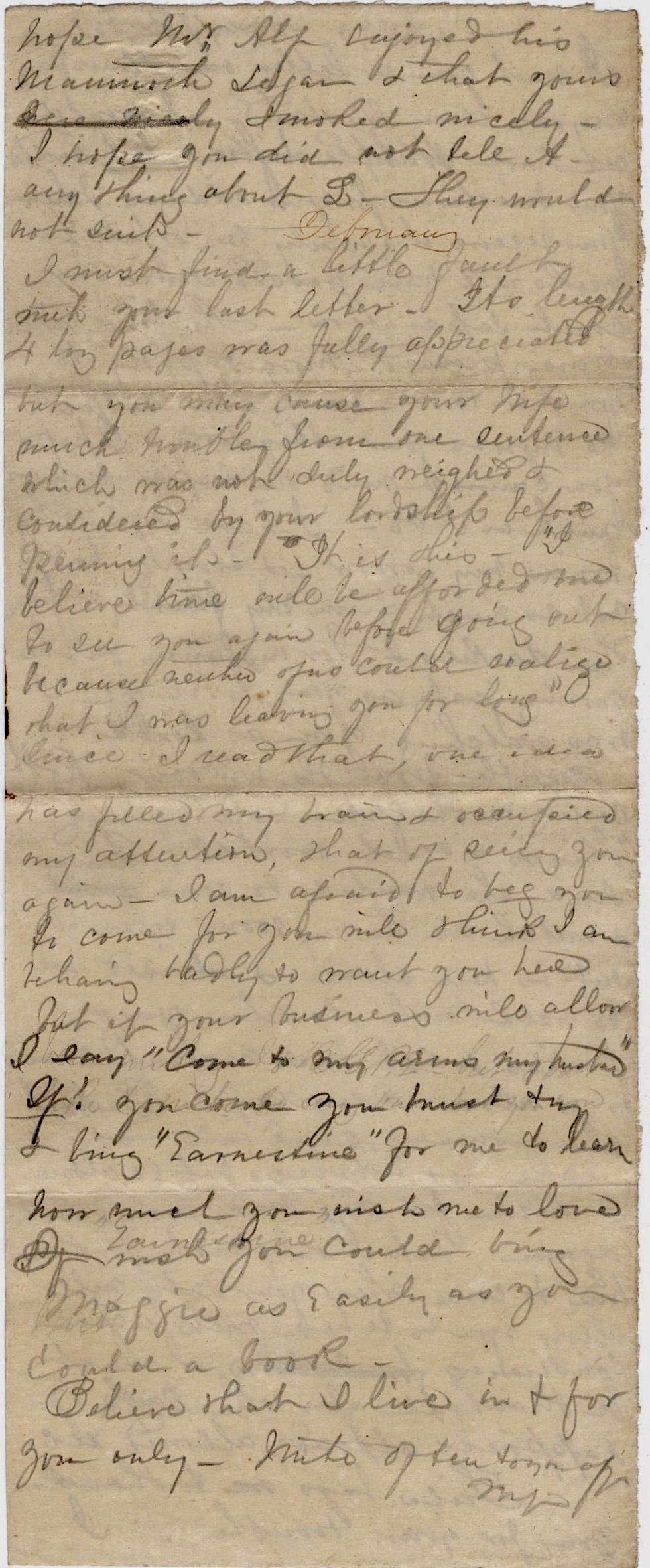 Tula begs me to thank you for your trouble. Hope Mr. Alf enjoyed his mammoth segar & that yours smoked nicely. I hope you did not tell Alf anything about L. They would not suit.I must find a little fault with your last letter. Its length of 4 long pages was fully appreciated but you may cause your wife much trouble from one sentence which was duly weighed and considered by your lordship before penning it. It is this—“I believe time will be afforded me to see you again before going out because neither of us could realize that I was leaving you for long.” Since I read that, one idea has filled my brain and occupied my attention. I am afraid to beg you to come for you will think I a behaving badly to want you here. But if your business will allow, I say, “Come to my arms my husband.” If! you come, you must try and bring “Ernestine” for me to lean how much you wish me to love. If Ernestine [does] not, you could bring Maggie as easily as you could a book. Believe that I live in and for you only, write often to your affectionate, — Wife