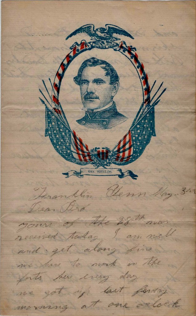 Yours of the 28th was received today. I am well and get along fine. We have to work on the forts here every day. 1 We got up last Friday morning at one o’clock and started out on a skirmish. We drove the Rebs six miles. The cavalry was ahead of us. They killed three or four and took about 25 prisoners.
