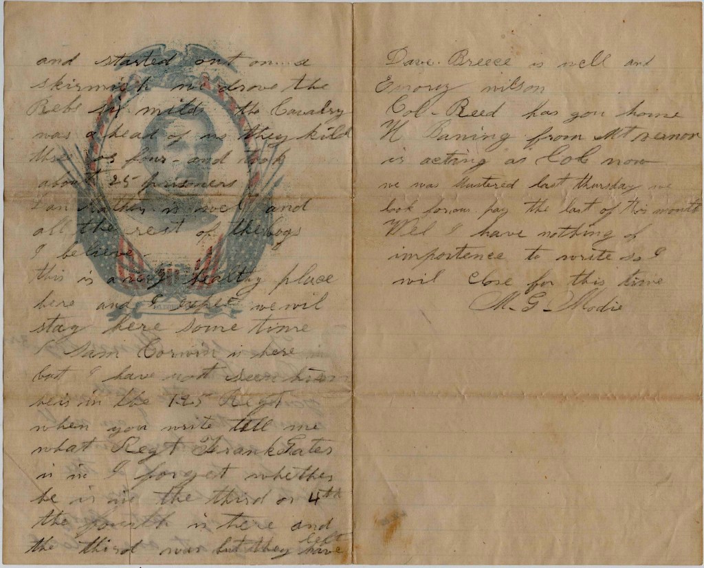 Col. [William Pitt] Reid has gone home. H[enry] Banning from Mt. Vernon is acting as Colonel now. We was mustered last Thursday. We look for our pay for the last of this month. Well, I have nothing of importance to write so I will close for this time. — M. G. Modie