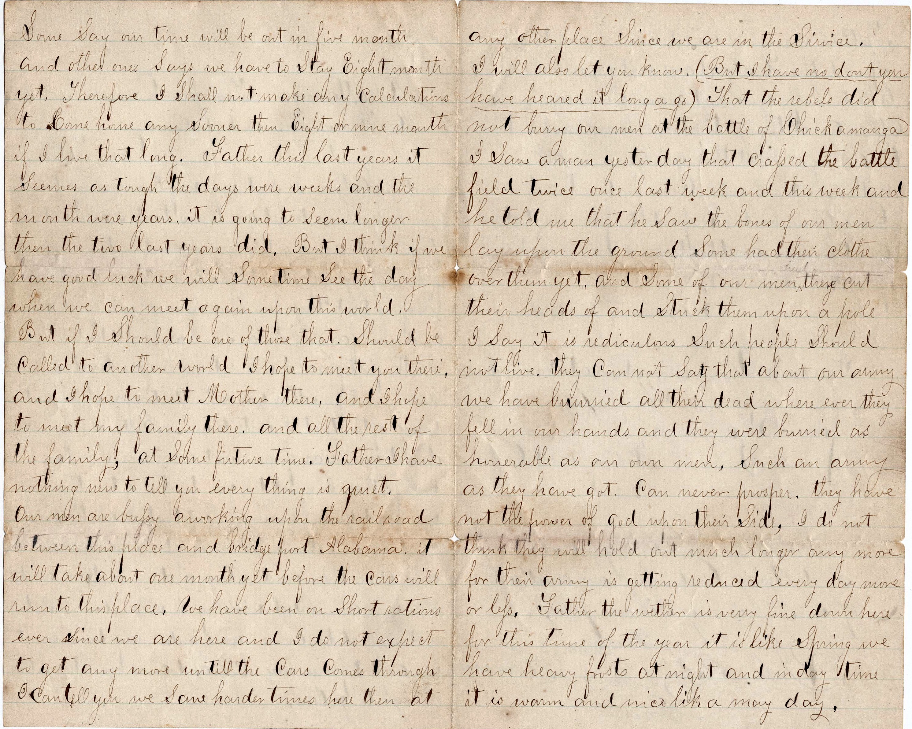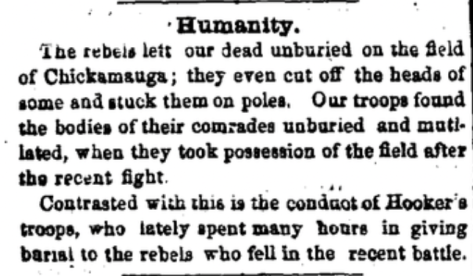 I will also let you know (but I have no doubt you have heard it long ago), that the rebels did not bury our men at the Battle of Chickamauga. I saw a man yesterday that crossed the battlefield twice—one last week and this week—and he told me that he saw the bones of our men lay upon the ground. Some had their clothes over them yet and some of our men, they cut their heads off and stuck them upon a pole. I say it is ridiculous. Such people should not live. They cannot say that about our army. We have buried all their dead wherever they fell in our hands and they were buried as honorable as our own men. Such an army as they have got can never prosper. They have not the power of God upon their side. I do not think they will hold out much longer anymore for their army is getting reduced every day, more or less.