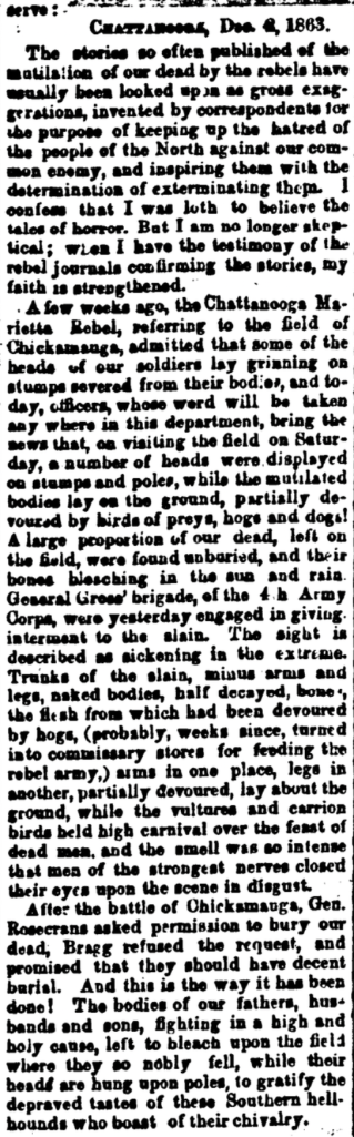 Loss of the field and Union retreat meant leaving dead and dying comrades on the field so the anguish expressed by Zarbaugh at the report of unburied and mutilated corpses was certainly understandable. Though Zarbaugh’s letter contains only hearsay, the reports of Rebel atrocities such as the dead left unburied for a couple of months on the battlefield, and the cutting off of heads and sticking them on stumps or poles was printed in many newspapers in December 1863.