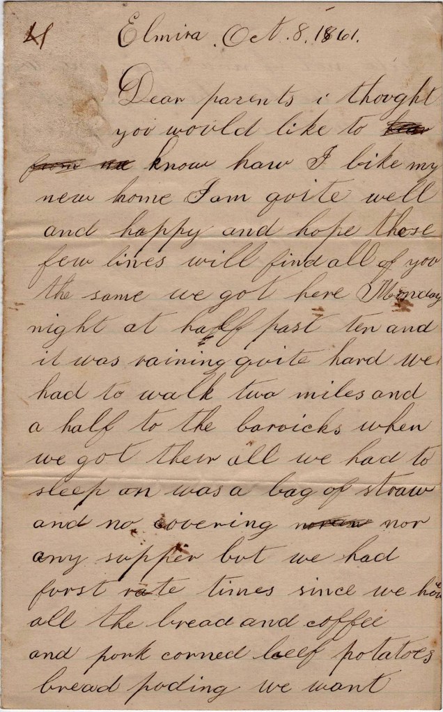 I thought you would like to know how I like my new home. I am quite well and happy and hope these few lines will find you all the same. We got here Monday night at half past ten and it was raining quite hard. We had to walk two miles and a half to the barracks. When we got there, all we had to sleep on was a bag of straw and no covering nor any supper but we had first rate times since. We have all the bread and coffee and pork, corned beef, potatoes and bread pudding we want.