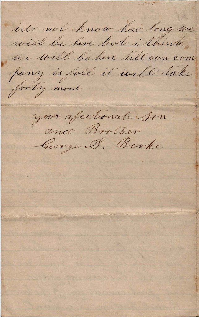 I do not know how long we will be here but I think we will be here till our company is full. It will take 40 more. Your affectionate son and brother, — George S. Burke