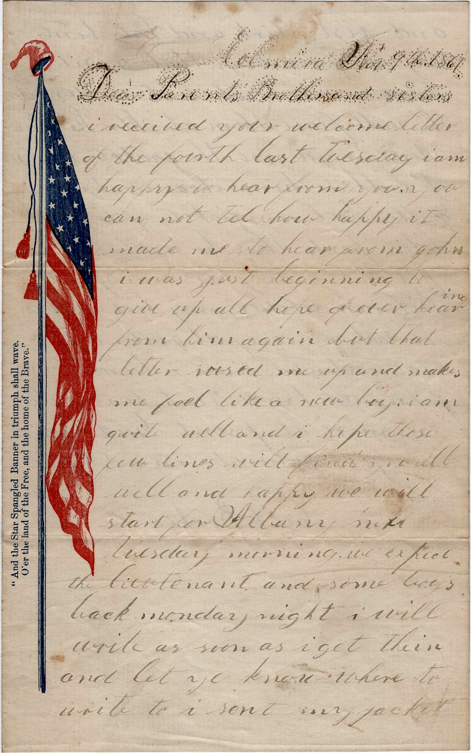 We will start for Albany next Tuesday morning. We expect the lieutenant and some boys back Monday night. I will write as soon as I get there and let you know where to write to. I sent my jacket and vest, shirt and hat home by one of our boys that went home on a furlough last Wednesday. He will leave them at Mr. Reynolds’ store for you. Give the jacket to Jim. It will do him charm [?] It is one of the Bull Run jackets. If he gets blue pants, then he will be able to put on as many airs as any of the Bull Run soldiers.