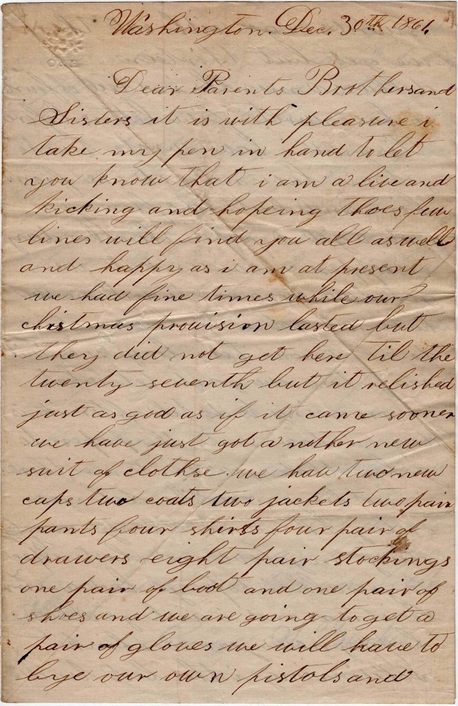 This is the awfullest mud hole I ever saw. We cannot go outside our tent without wading through a foot of mud. We have got 145 men in our company adn we have all our horses, 110. Riley [Benedict] is a driver and I am No. 1 on te cannon. I think I am about as well drilled as any man in the company although self praise os no recommend. We expect to cross the river in two or three weeks but I might be mistaken. But I hope to get out of this mud hole before long. I think we have got the best company in the regiment, so the Colonel says. He is going to make his headquarters with this company.