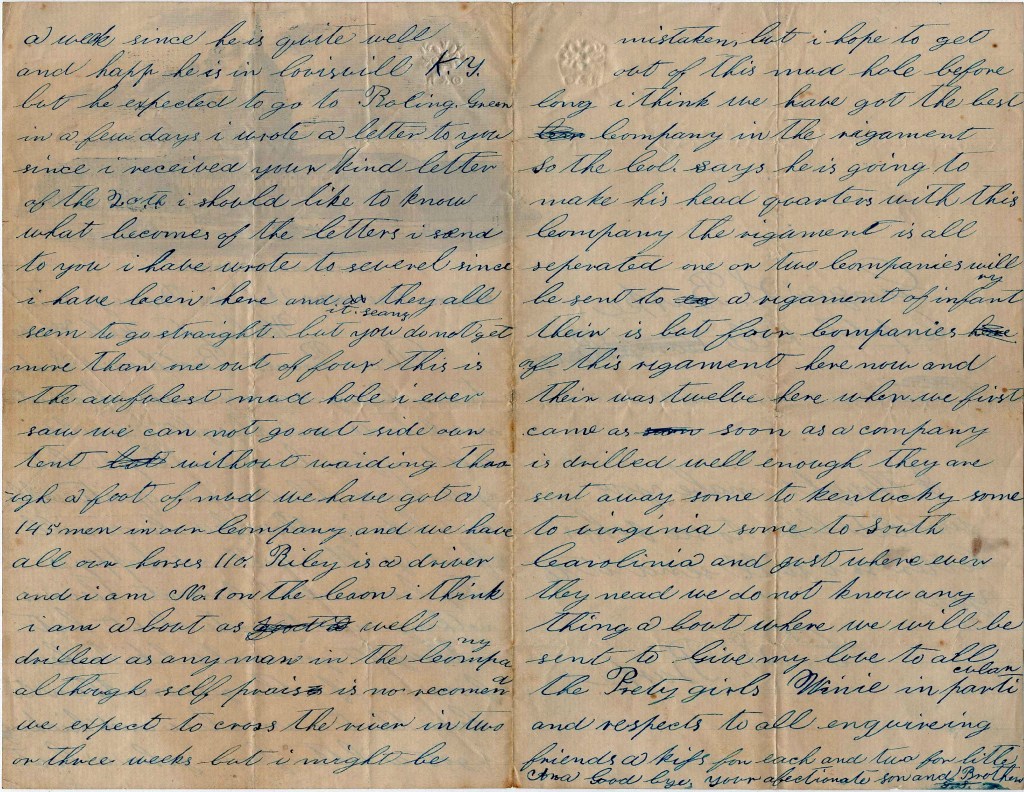 I got a letter from John about a week since. He is quite well and happy. He is in Louisville, Kentucky, but he expected to go to Bowling Green in a few days. I wrote a letter to you since I received your kind letter of the 20th. I should like o know what becomes of the letters I send to you. I have wrote several since I have been here and they all seem to go straight. But it seems you do not get more than one out of four.