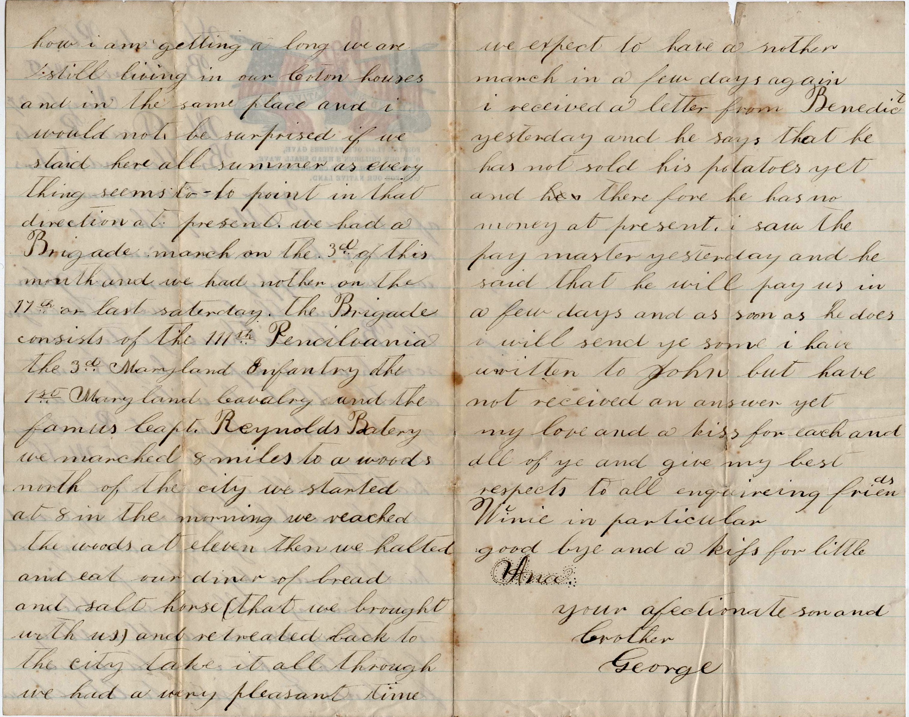 We are still living in our cotton houses and in the same place and I would not be surprised if we stayed here all summer as everything seems to point in that direction at present. We had a Brigade march on the 3rd of this month and we had another on the 17th or last Saturday. The Brigade consists of the 111th Pennsylvania, the 3rd Maryland Infantry, the 1st Maryland Cavalry, and the famous Capt. Reynolds’ Battery. We marched 8 miles to a woods north of the city. We started at 8 in the morning. We reached the woods at eleven. Then we halted and eat our dinner of bread and salt horse (that e brought with us) and retreated back to the city. Take it all through, we had a very pleasant time.