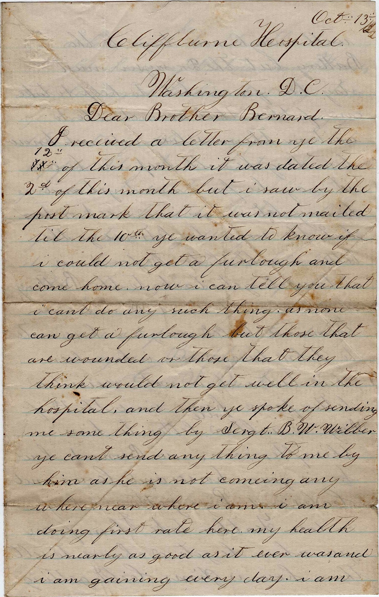 I received a letter from ye the 12th of this month. It was dated the 2d of this month but I saw by the postmark that it was not mailed till the 10th. Ye wanted to know if I could not get a furlough and come home. Now I can tell you that I can’t do any such thing as none can get a furlough but those that are wounded or those they think would not get well in the hospital. And then ye spoke of sending me something by Sgt. B. W. Wilber. Ye can’t send anything to me by him as he is not coming anywhere near where I am.