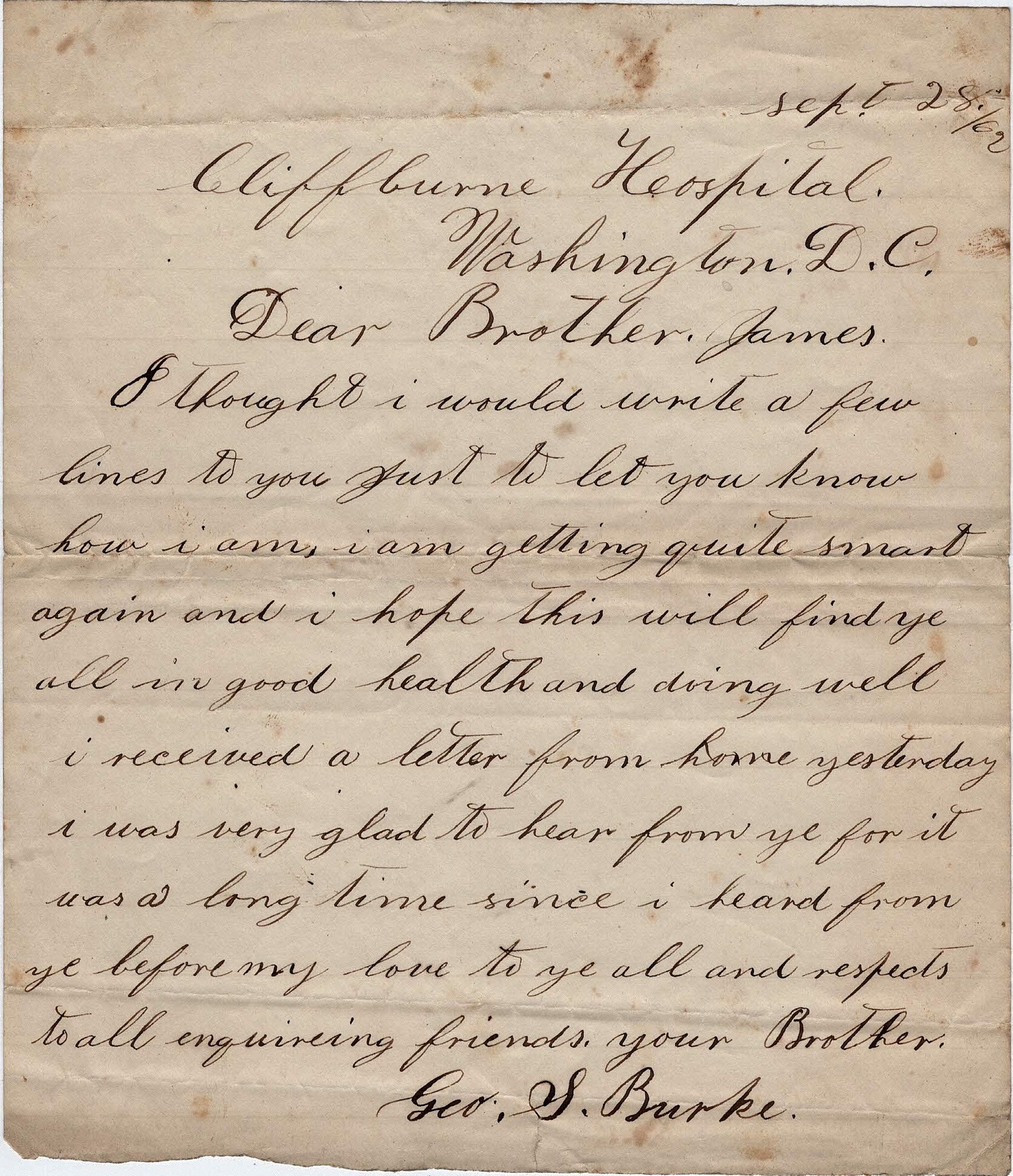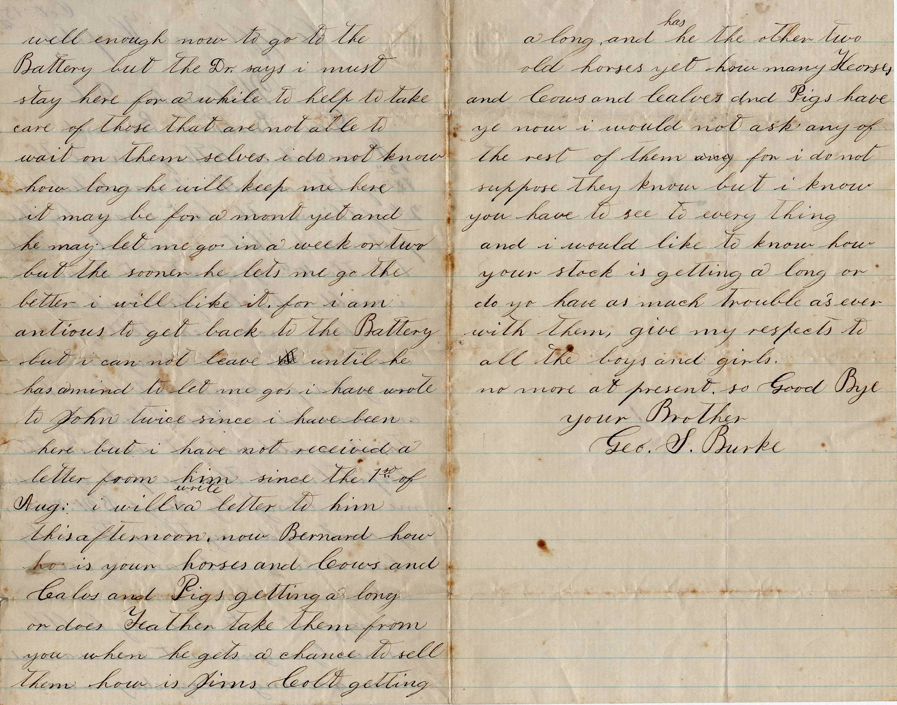 Give my respects to all the boys and girls. No more at present. So goodbye. Your brother, — George S. Burke