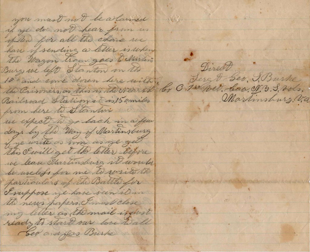 You must not be alarmed if ye do not hear from us often for all the chance we have of sending a letter is when the wagon train goes to Martinsburg. We left Staunton on the 10th and came down here with the prisoners as this is the nearest railroad station. It is 150 miles from here to Staunton. We expect to go back in a few days by the way of Martinsburg. If ye write as soon as ye get this, I will get the letter before we leave Martinsburg. It would be useless for me to write the particulars of the battle for I suppose ye have seen it in the newspapers.