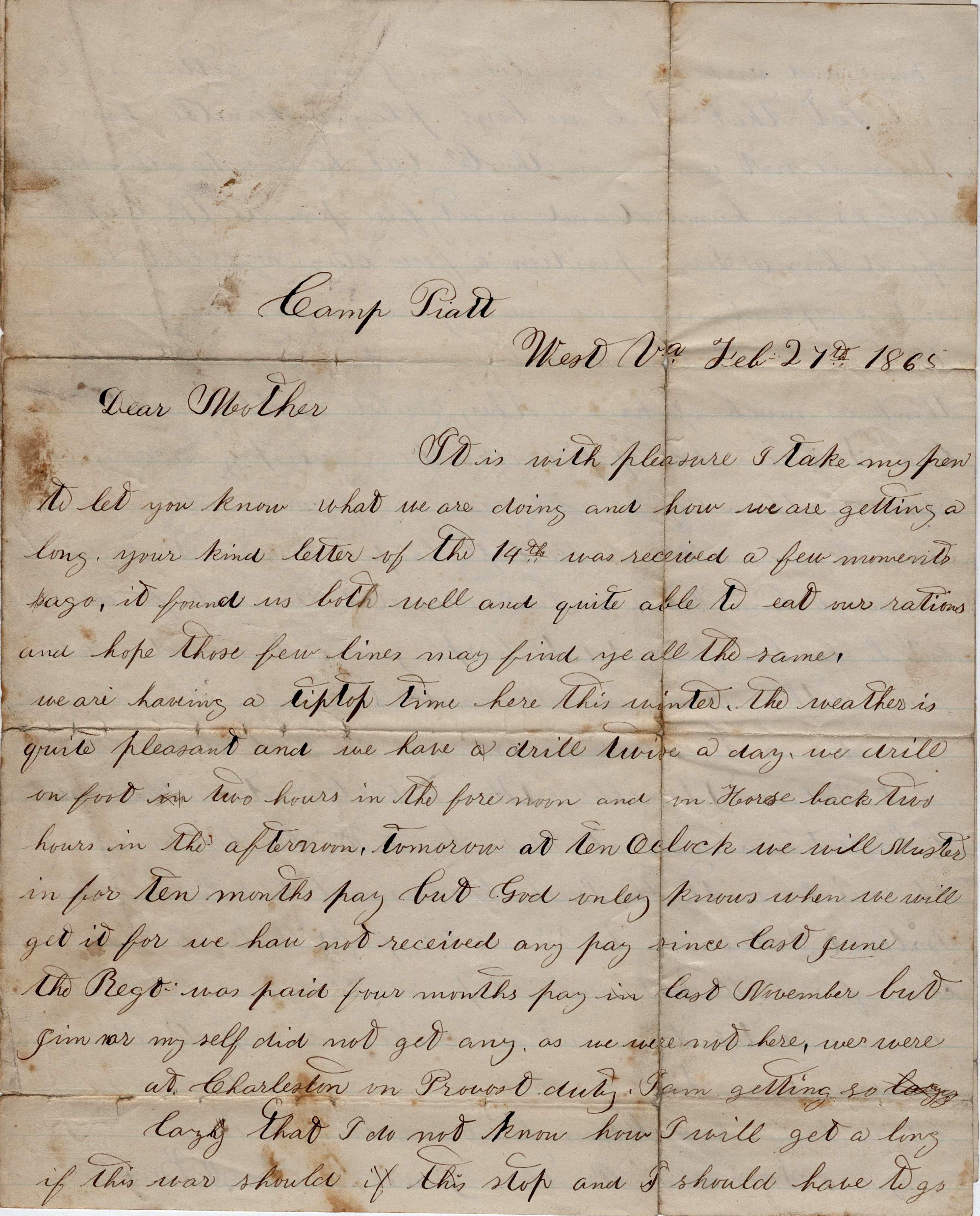 We are having a tip top time here this winter. The weather is quite pleasant and we have a drill twice a day. We drill on foot two hours in the forenoon and on horseback two hours in the afternoon. Tomorrow at 10 o’clock we will muster in for ten months pay but God only knows when we will get it for we have not received any pay since last June. The regiment was paid four months pay in last November but Jim nor myself did not get any as we were not here. We were at Charleston on Provost Duty. I am getting so lazy that I do not know how I will get along if this war should stop and I should have to go home and work for my living.