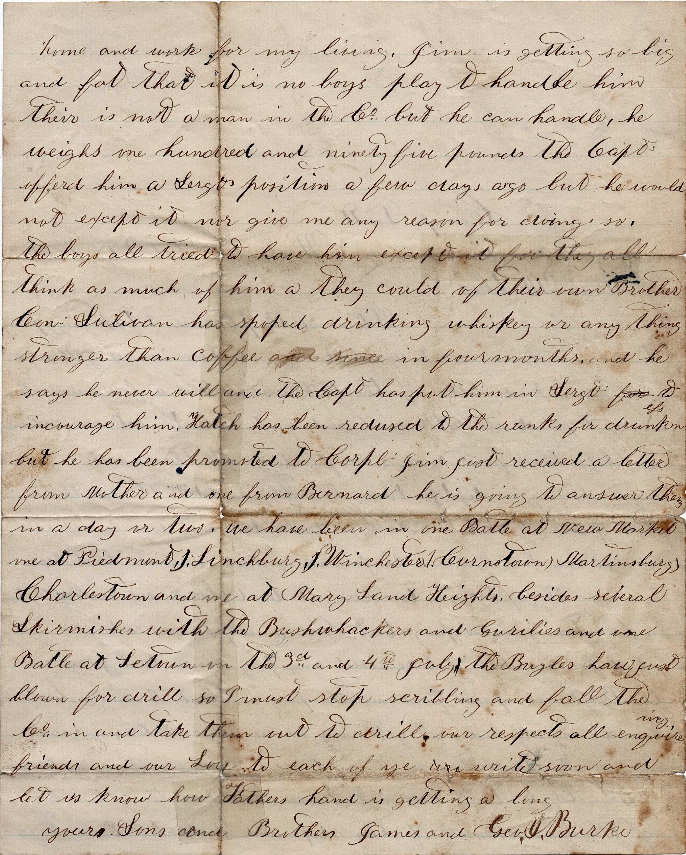 The bugles have just blown for drill so I must stop scribbling and fall the company in and take them out to drill. Our respects to all enquiring friends and our love to each of ye. Write soon and let us know how Father’s hand is getting along. Your sons and brothers, — James and George S. Burke