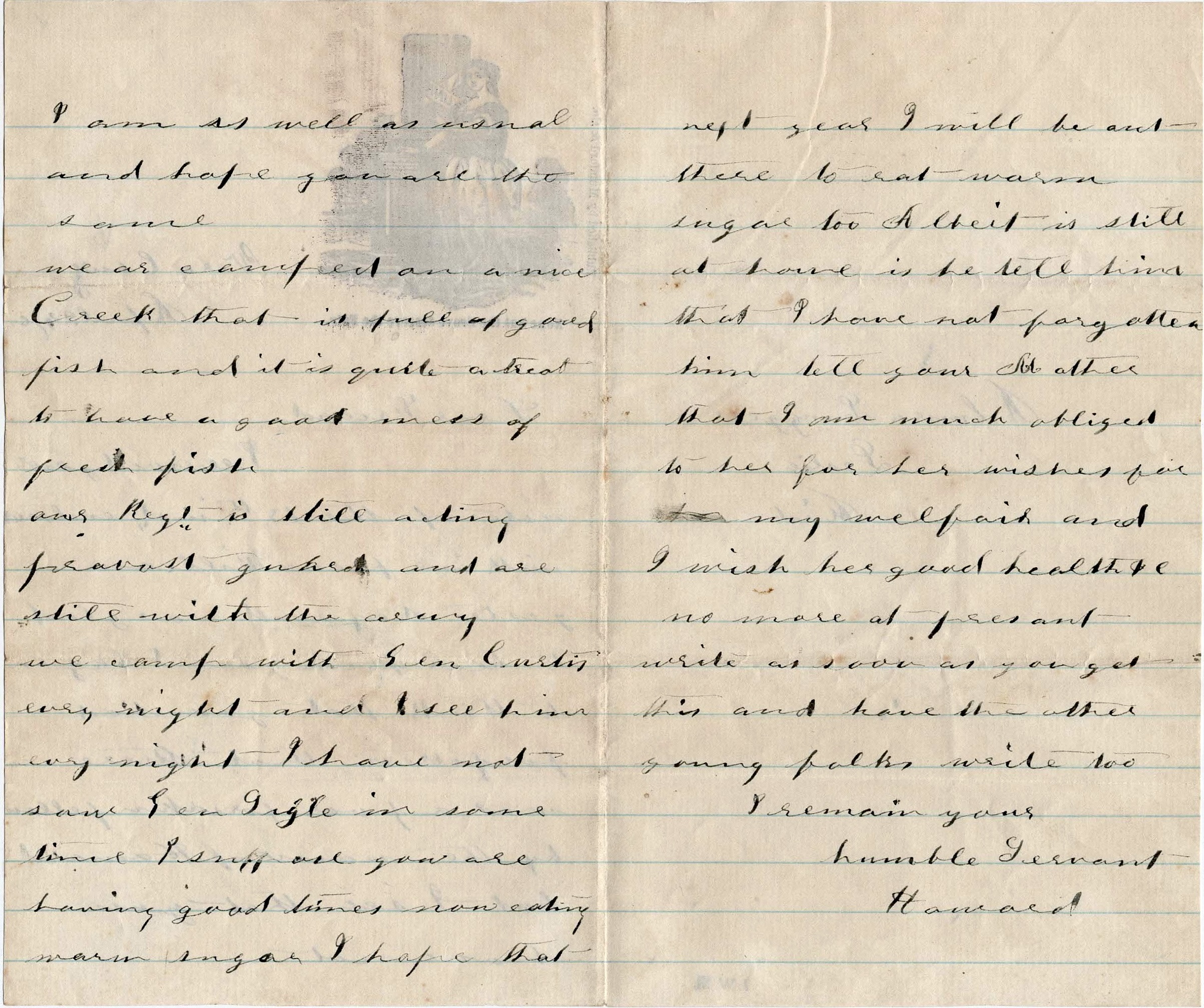 I suppose you are having good times now eating warm sugar. I hope that next year I will be out there to eat warm sugar too. Albert is still at home is he? Tell him that I have not forgotten him. Tell your Mother that I am much obliged to her for her wishes for my welfare and I wish her good health &c.