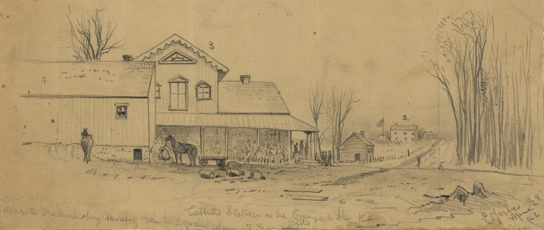 Friday 18—Left camp at 6.30 a.m. and marching on the A&O [Orange & Alexandria] Railroad tracks, reached Catlett’s Station about 2 p.m. Camped in a large meadow. Wood distant, Water scarce and bad.